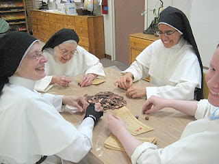 Sr. Maria Cabrini, Sr. Mary Catherine, Sr. Mary Gabriel and Sr. Mary Dominic hard at work counting and rolling pennies.
