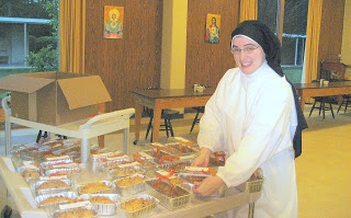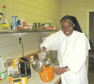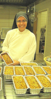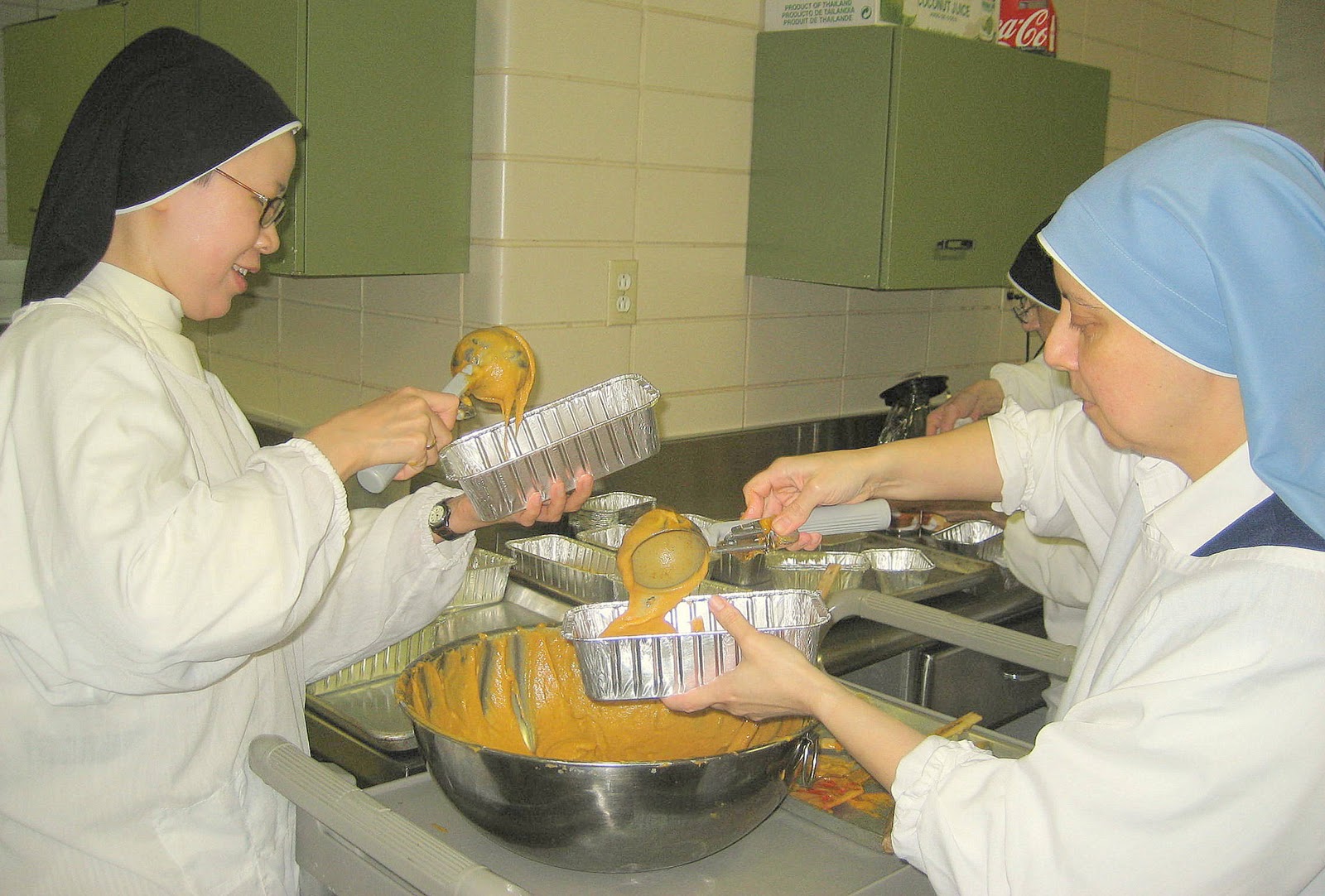 We have a tradition of giving baked goods to our local friends and benefactors–usually at Christmas–but this year we thought we\’d try a different season and thank them, appropriately enough, at Thanksgiving time! The fall season lends itself to pumpkin bread, so that\’s what we decided to make. Several enthusiastic sisters teamed up in the kitchen to produce many loaves of pumpkin bread!