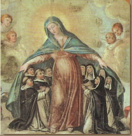 \”As Blessed Dominic looked around, he could see religious of all the orders but his own before the throne of God. He began to weep bitterly…The Lord asked him, \’Why are you weeping so?\’ \’I am weeping because I see all the other orders here but no sign of my own.\’ The Lord said to him, \’Do you wish to see your Order?\’ and he answered, \’Yes, Lord.\’ Then the Blessed Virgin opened the cloak she was wearing and spread it out before Blessed Dominic, to whom it seemed vast enough to cover the entire heaven, and under it he saw a large multitude of the brethren. Then prostrating himself, Blessed Dominic gave thanks to God and to Blessed Mary his mother.\”