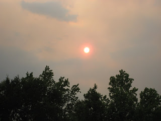 The sun had a reddish aura because of all the smoke in the air.
