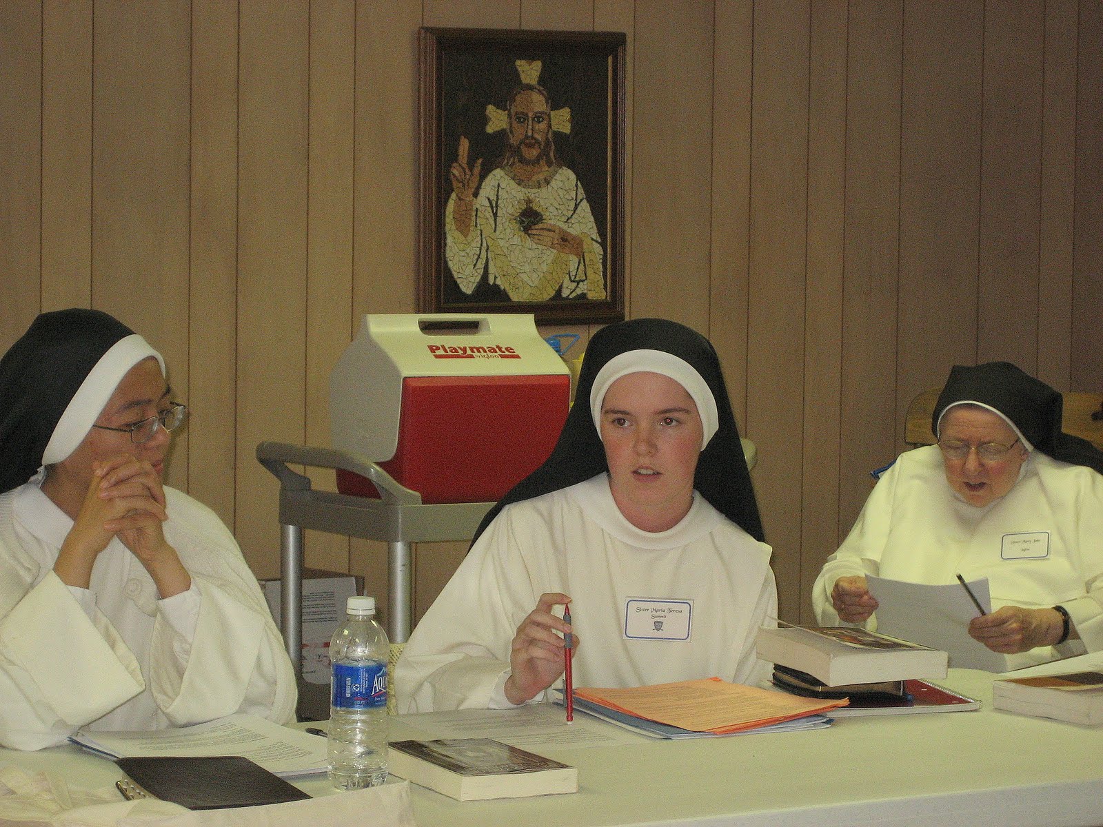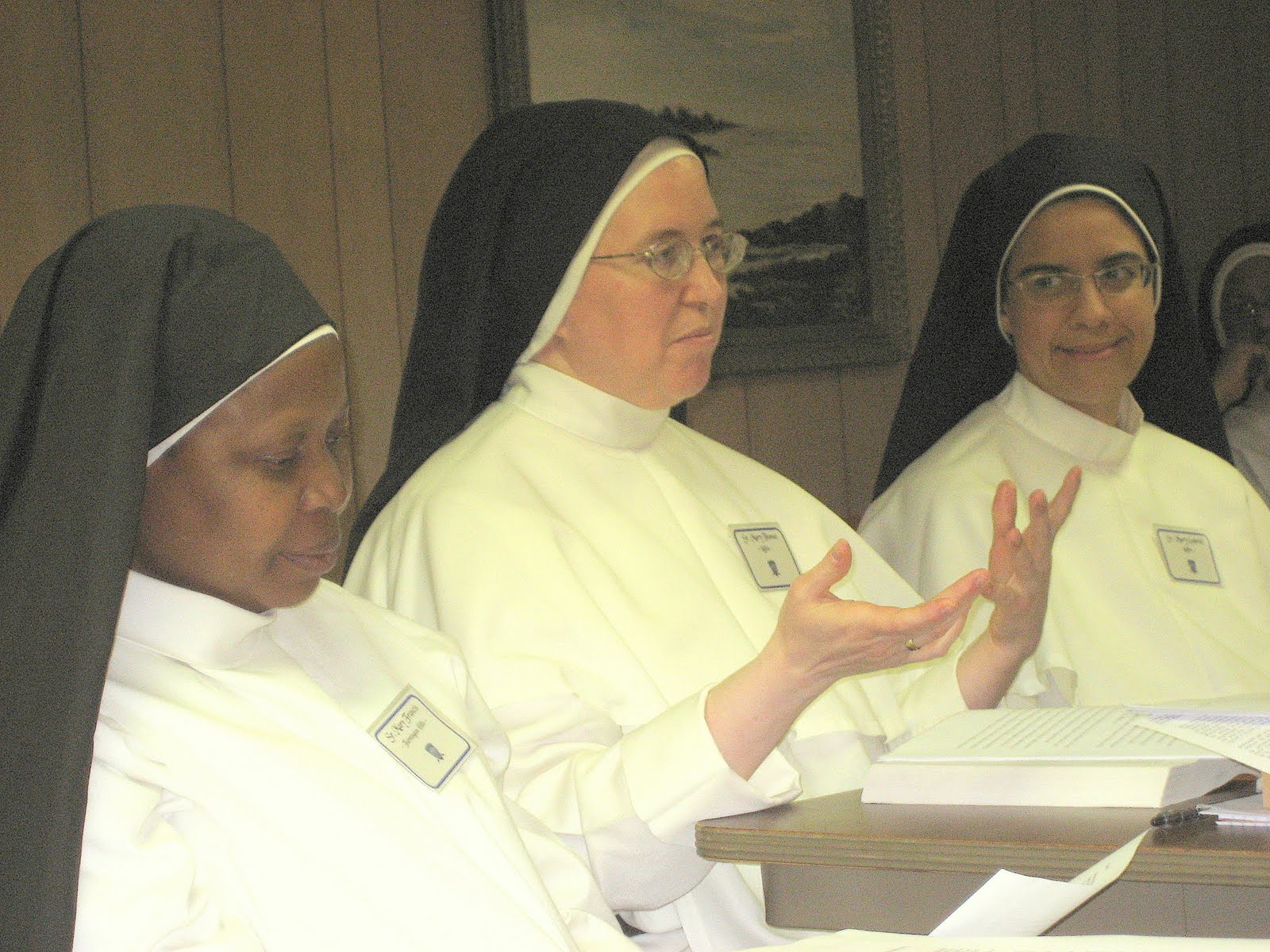 Sr. Mary Thomas (Lufkin, TX) gestured emphatically while discussing the philosophy of Immanuel Kant. Sr. Mary Frances (Farmington Hills, MI) and Sr. Mary Gabriel (Lufkin, TX) are listening!