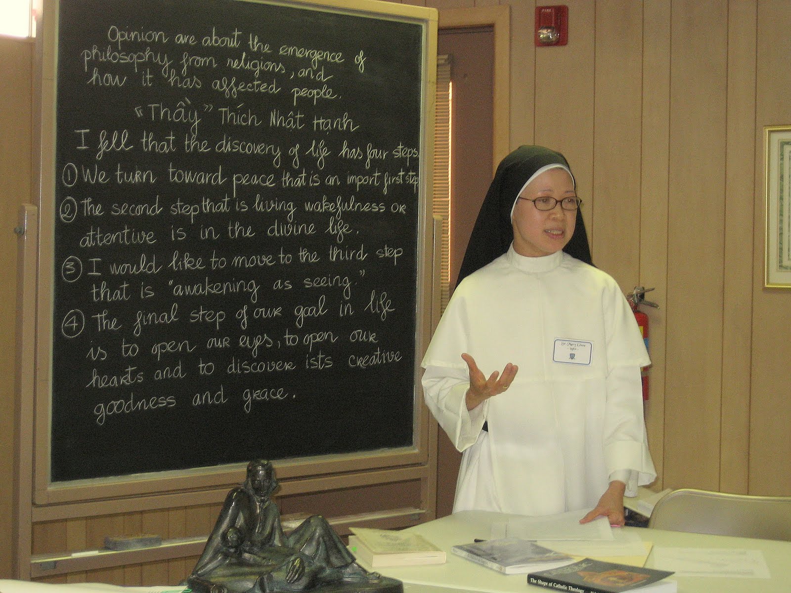 Sr. Maria Teresa (Summit, NJ) explains to the seminar about the \”Materialists, the Idealists, and the Reconciled\” while Sr. Joseph Maria (Summit) and Sr. Mary John look on.
