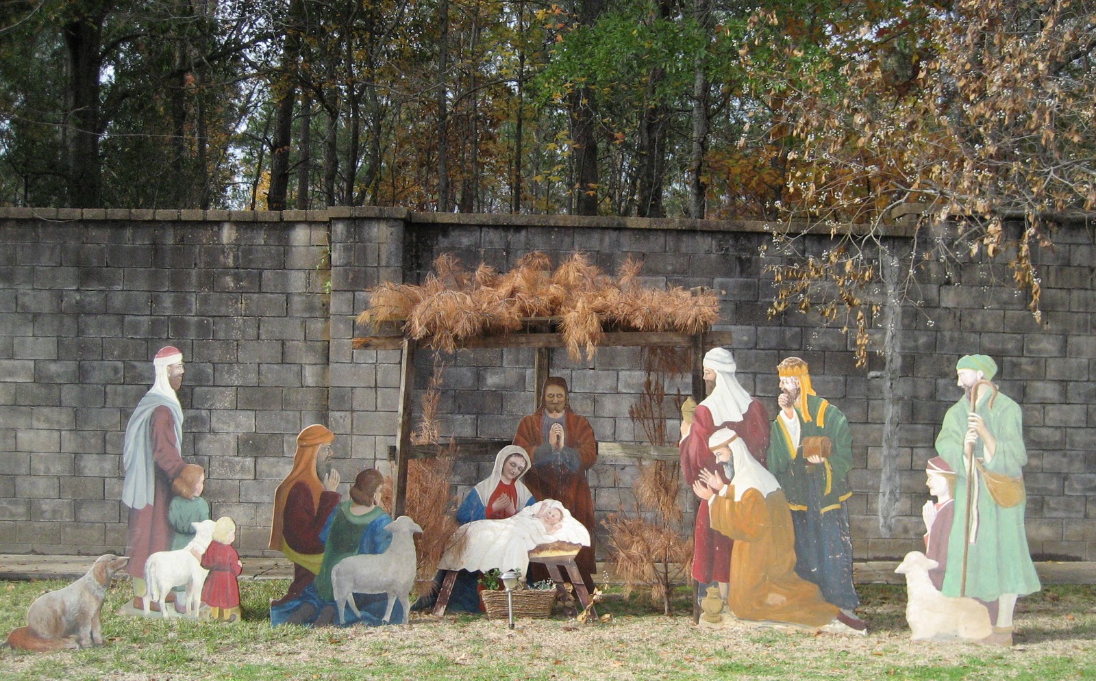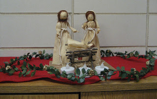 Our Nativity scenes range from the small and simple, like this cornhusk version in the kitchen (we thought it was kind of appropriate!)…