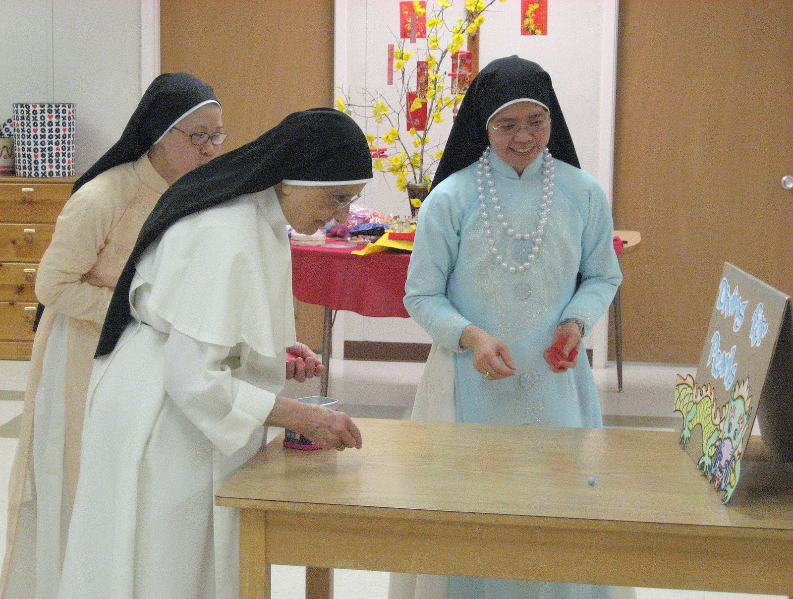We also played several fun games, including this one where you had to roll or throw a \”pearl\” into the dragon! As you can see, some of our sisters were able to wear traditional Vietnamese dresses over their habits (donated by a friend of the community).