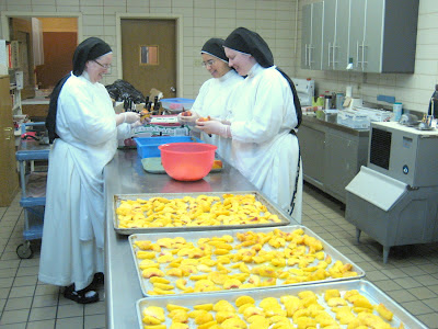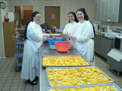 We have been really blessed by our benefactors this year, especially in gifts of food! Yesterday we received 23 boxes of very ripe peaches. We gave a few away, and started to take care of the rest.