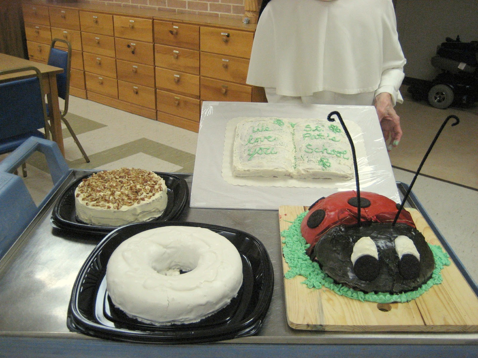 The small cake with nuts on top is a hummingbird cake made by Sr. Mary Gabriel (with help from others); the cake below it (like a large white doughnut) is a cake based on a recipe by Martha Washington (the wife of President George Washington) baked by Sr. Mary Jeremiah; the darling ladybug cake was baked and decorated by Sr. Mary Dominic, and Sr. Maria Cabrini is holding her cake creation, an open book with the words, \”We Love You, St. Pat\’s School\” written in green and decorated with shamrocks! Sr. Marie Augustine made some delicious cookies, too (unfortunately not pictured). We hope our small contribution of desserts will help support St. Patrick\’s School at the gala and in years to come. Although we have chosen to lead a hidden life of prayer, we enjoy making our own contribution to our local parishes and supporting the efforts of the Church in general. These cakes are a reminder of all the prayers that we send up every day, not only for St. Patrick\’s School, but for the whole world!