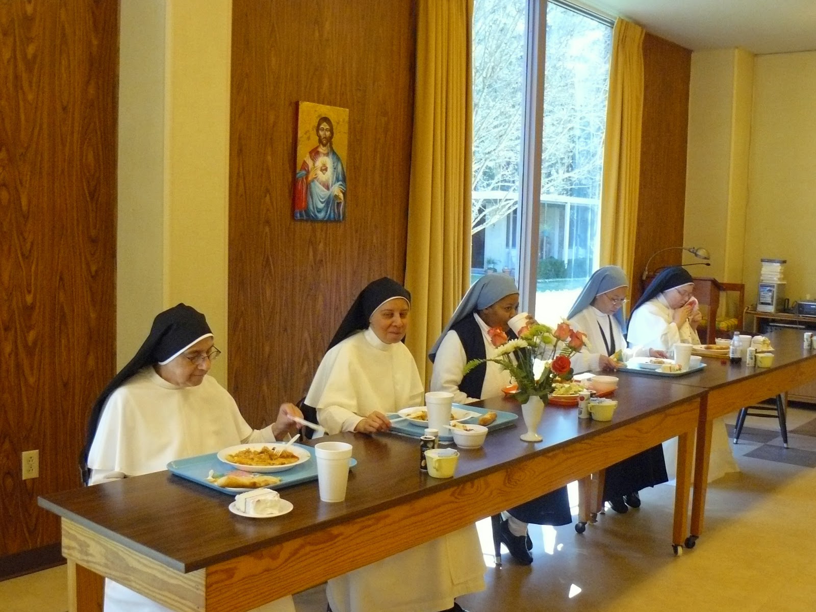 Sr. Bernadette Marie (do you recognize her in the new black veil?) smiles while eating dinner.
