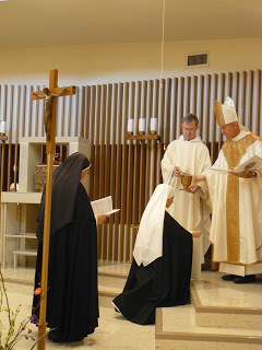 Bishop Strickland was here for the celebration of consecrated life, and he was the main celebrant at our Mass today. Here he blesses Sr. Bernadette Marie\’s scapular before giving her the black veil.