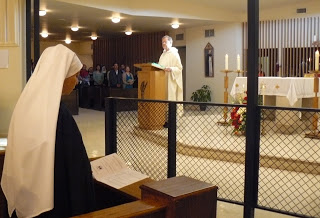 Sr. Bernadette Marie listens as our chaplain, Fr. Paul Philibert, proclaims the Gospel