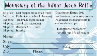 Just send your name and snail mail address to our email address, nuns@lufkintxnuns.com, and we will happily fill out your tickets and enter your name in our drawing to be held on Easter Sunday, March 31, 2013! No donations are required but any donation you would like to make will benefit our life of prayer. You can make donations (if you would like to) using PayPal–the link is conveniently located at the top right hand corner of this blog, or through our website on the Donate page HERE.