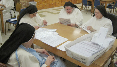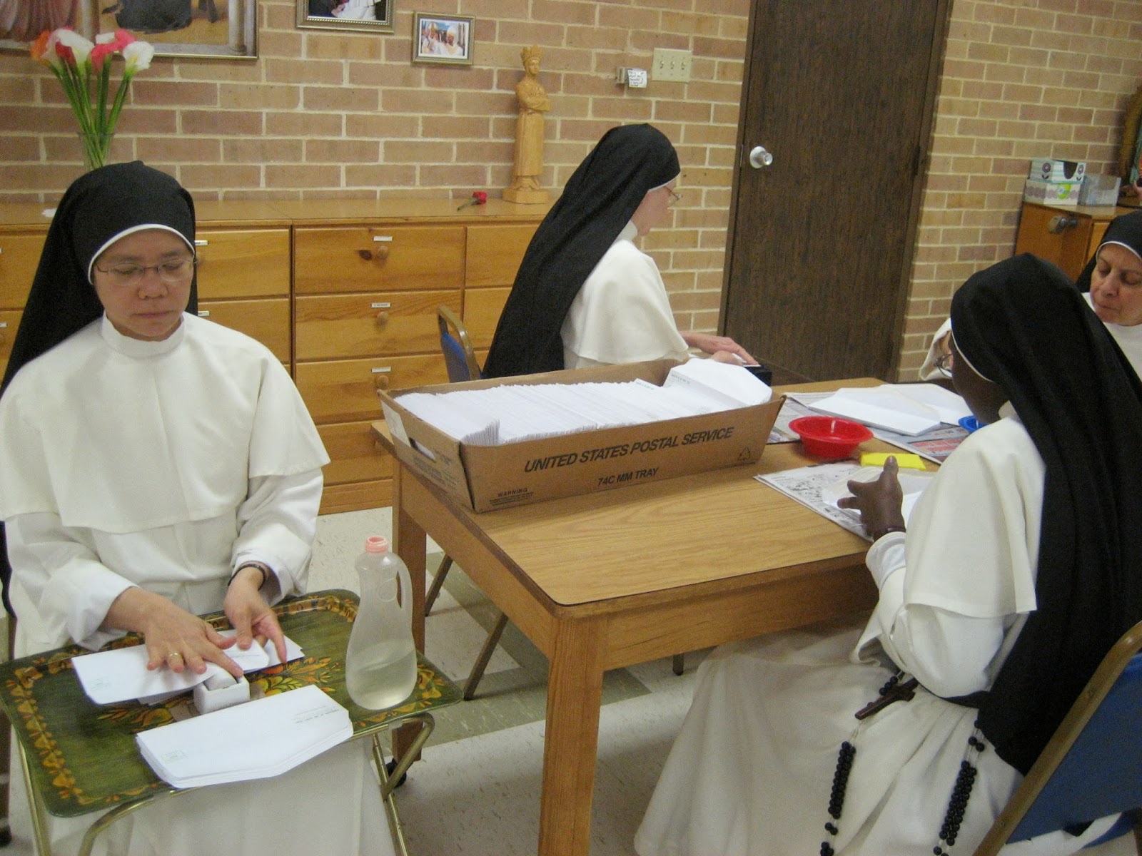 Sr. Mary Christine, Sr. Mary Magdalene, Sr. Bernadette Marie, and Sr. Marie Augustine all sealing envelopes