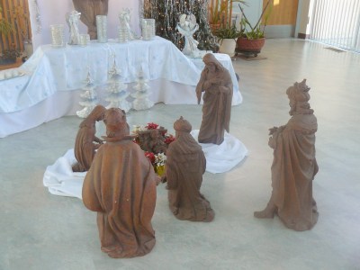 Having seen the star in the heavens, the Magi made an interesting journey around the monastery grounds this year seeking the Holy Family. We have a lovely creche set which can be put outside, and this year the novitiate used Mary, Joseph and the child Jesus in their decorations for the Chapter Hall (as you can see in an earlier post). The Magi (which go with the set) were spotted as 2014 began, traveling toward the Chapter Hall. One was seen starting from the gate that leads into our monastery; another was seen in Sr. Mary Jeremiah\’s garden; a third was discovered on our trail in the woods. We eagerly watched each day to see where the Magi would travel next. One day they stopped to converse in the middle of the cloister; one day they were peeking inside the novitiate; one day we found them peering into the refectory. At last, they found what they were looking for!