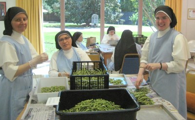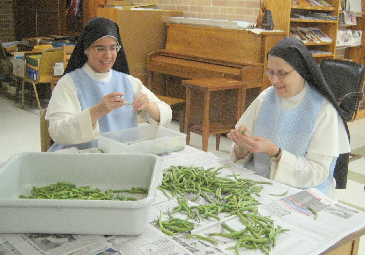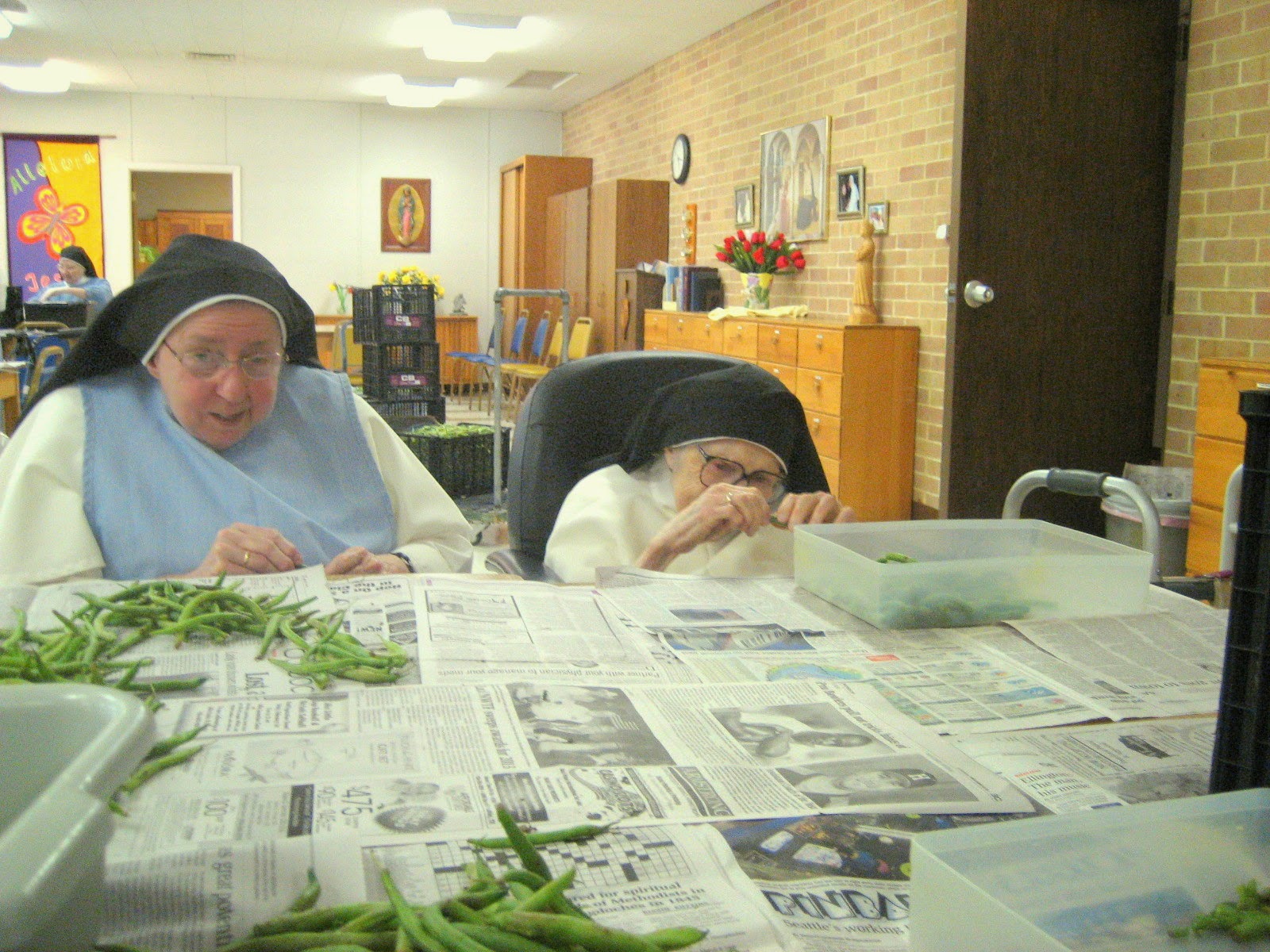Sr. Mary John and Sr. Mary Lucy \”snapping\” away at the beans