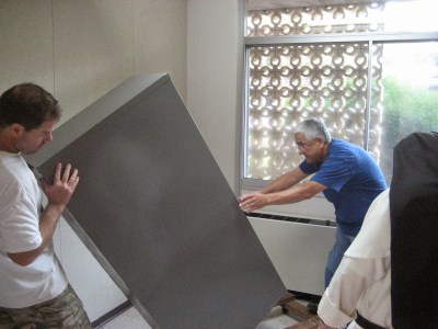 Sr. Mary John watches carefully as the Knights move a filing cabinet