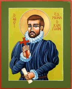 St. Edmund Campion (c.1540-1581) was a Jesuit priest and martyr for the faith in Elizabethan England, when it was a crime to be a Catholic. He left a promising career in England to become a Catholic priest and a Jesuit, returning to England secretly in 1579. While ministering to imprisoned Catholics in London, he wrote a challenge to the Protestant authorities called \”Campion\’s Brag\”. This, and the publication of his treatise \”Ten Reasons\”, caused great sensation in England and efforts to capture Campion were stepped up. He was finally captured in Norfolk in 1581, and after repeated tortures was executed at Tyburn on December 1.
