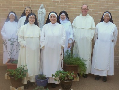 From left to right: Sr. Denise Marie (Summit), Sr. Mary Thomas (Farmington Hills), Sr. Mary Rose (Lufkin), Sr. Mary Catharine (Summit), Sr. Maria Christine (Menlo Park), Fr. Walter Wagner, OP (priest consultant), and Sr. Anna Marie (Springfield).