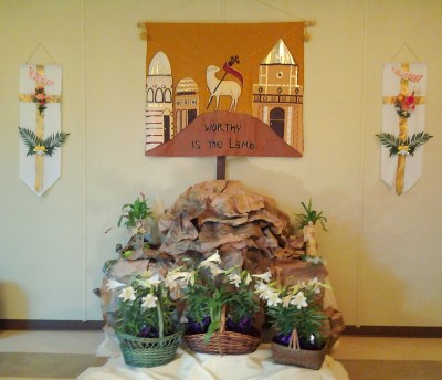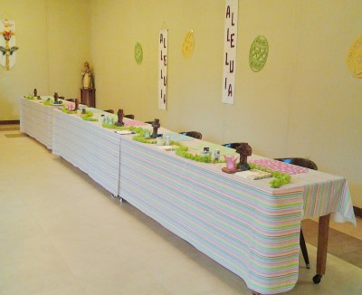 The center of the refectory! The novitiate constructed an \”Easter mountain\” somehow and highlighted it with Easter flowers and a spotlight (you can see the shadow on the wall!). They also used this classic banner made some years ago but still a favorite. In case you can\’t read it, it says \”Worthy is the Lamb\”. Amen! Alleluia!