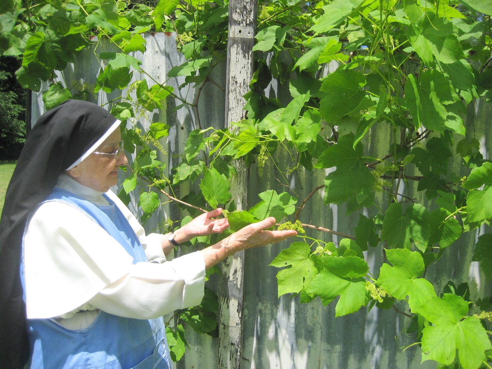 Looking for grapes…they are still ripening (although some have turned to raisins in the now hot sun!). Since the squirrels and birds enjoy them too, we\’re not sure how many Sister will be able to harvest– but we hope for a few bunches at least!