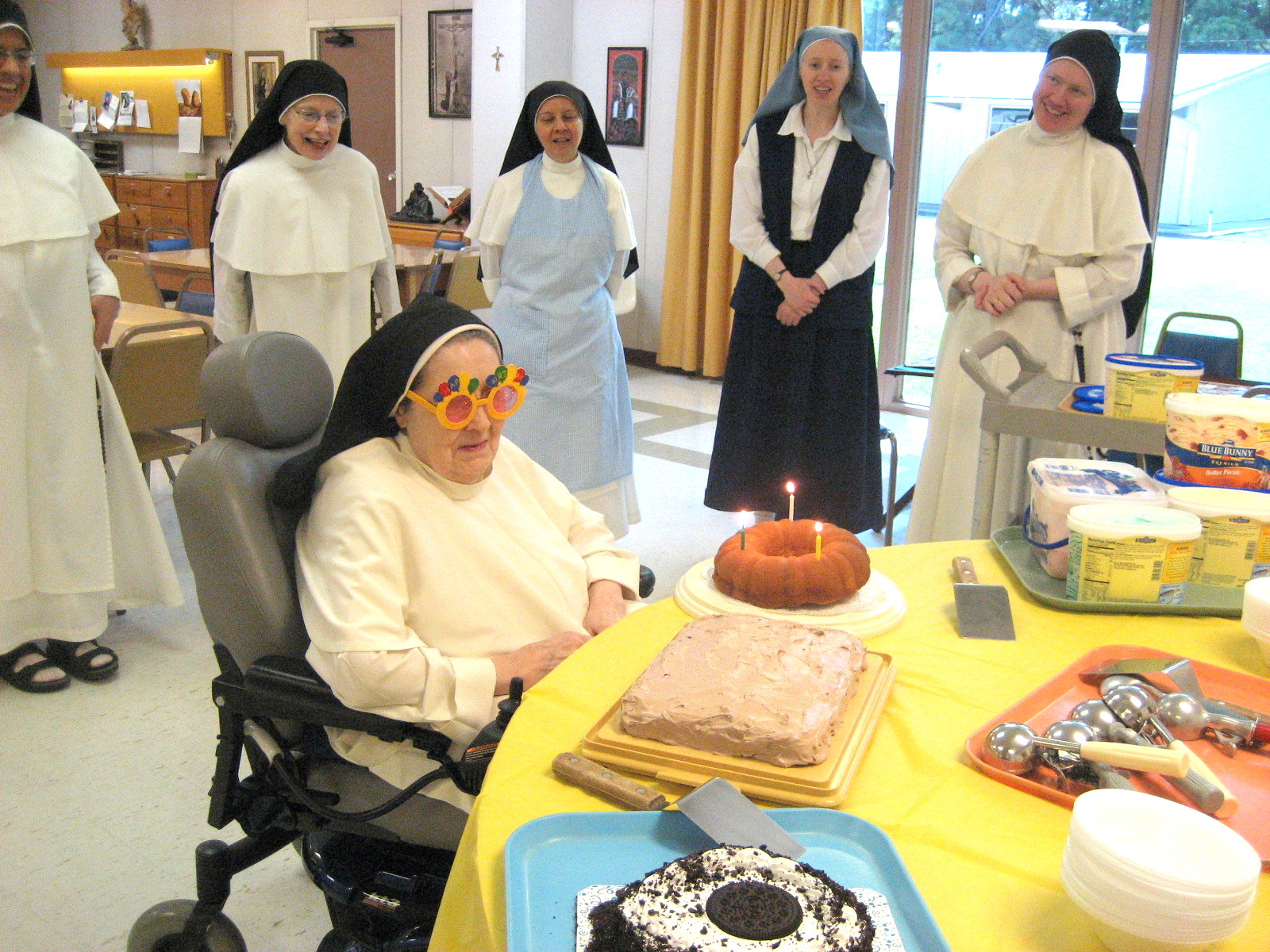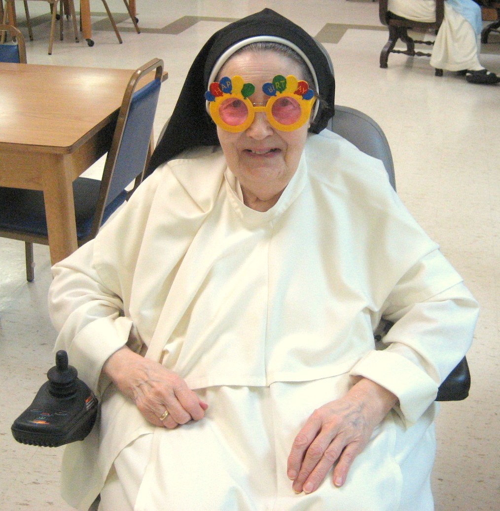 Sister Mary Regina in her \”Happy Birthday\” glasses!