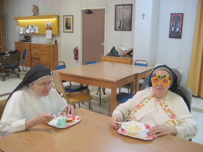 Enjoying the cake and ice cream treat with Sr. Miriam (left)