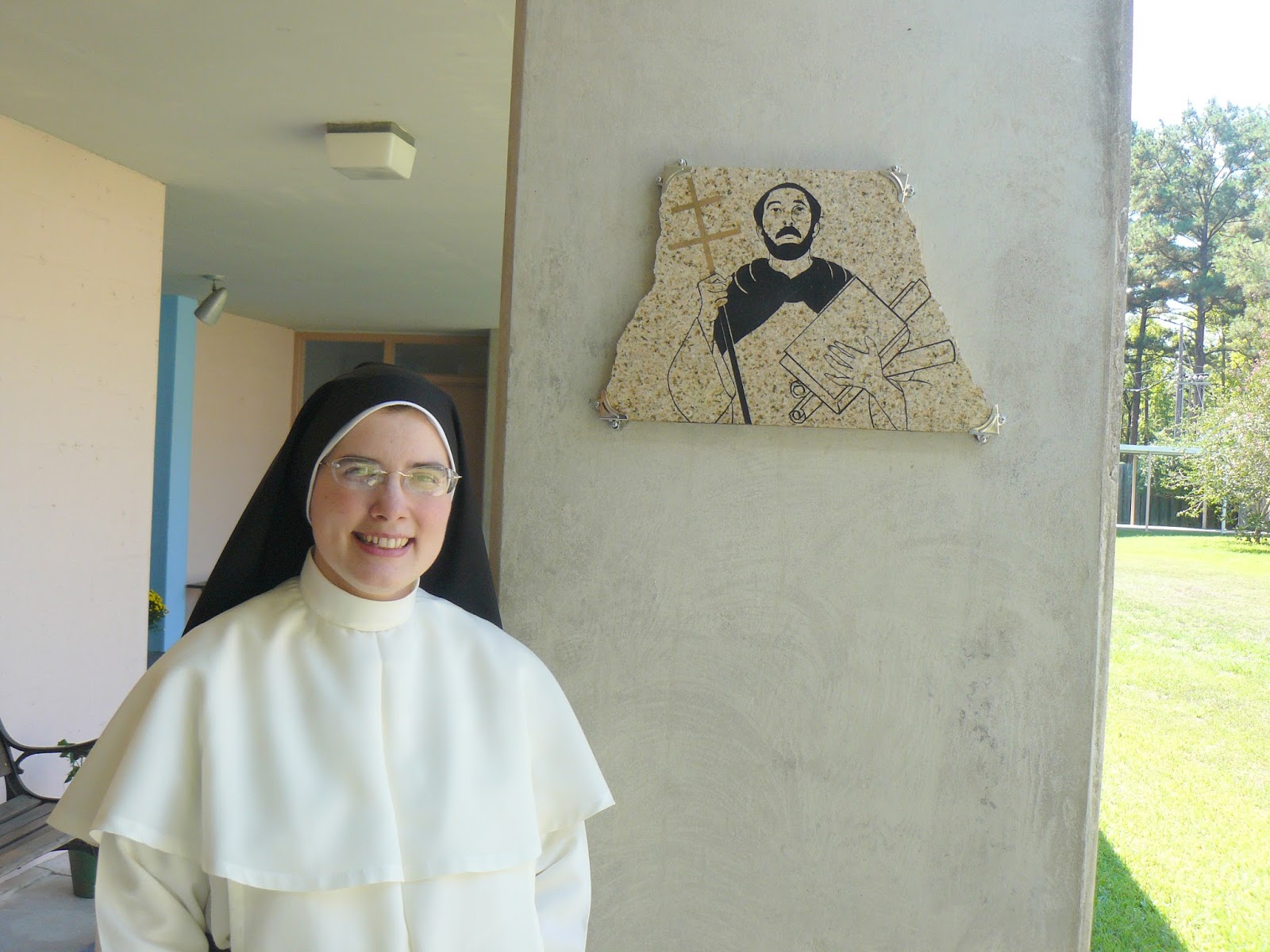 Sr. Mary Rose is standing next to the first, an image of St. Dominic, the founder of the Dominican Order. He holds a walking staff (in the shape of a cross) in one hand and assorted books and scrolls in the other. He seems to be silently encouraging us to walk forward and onward, guided by the Cross and carrying the intellectual treasures that will help to renew the Church in our time.