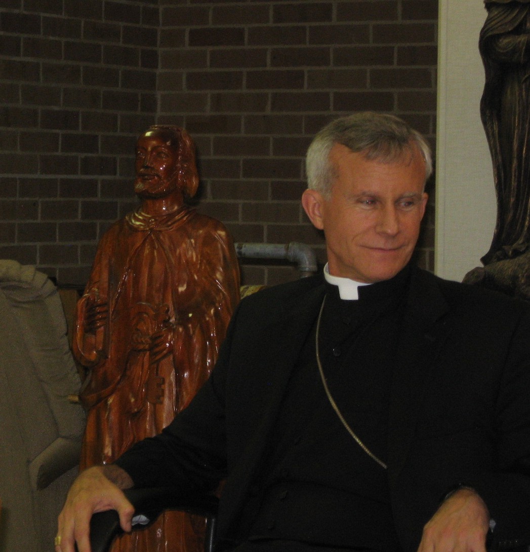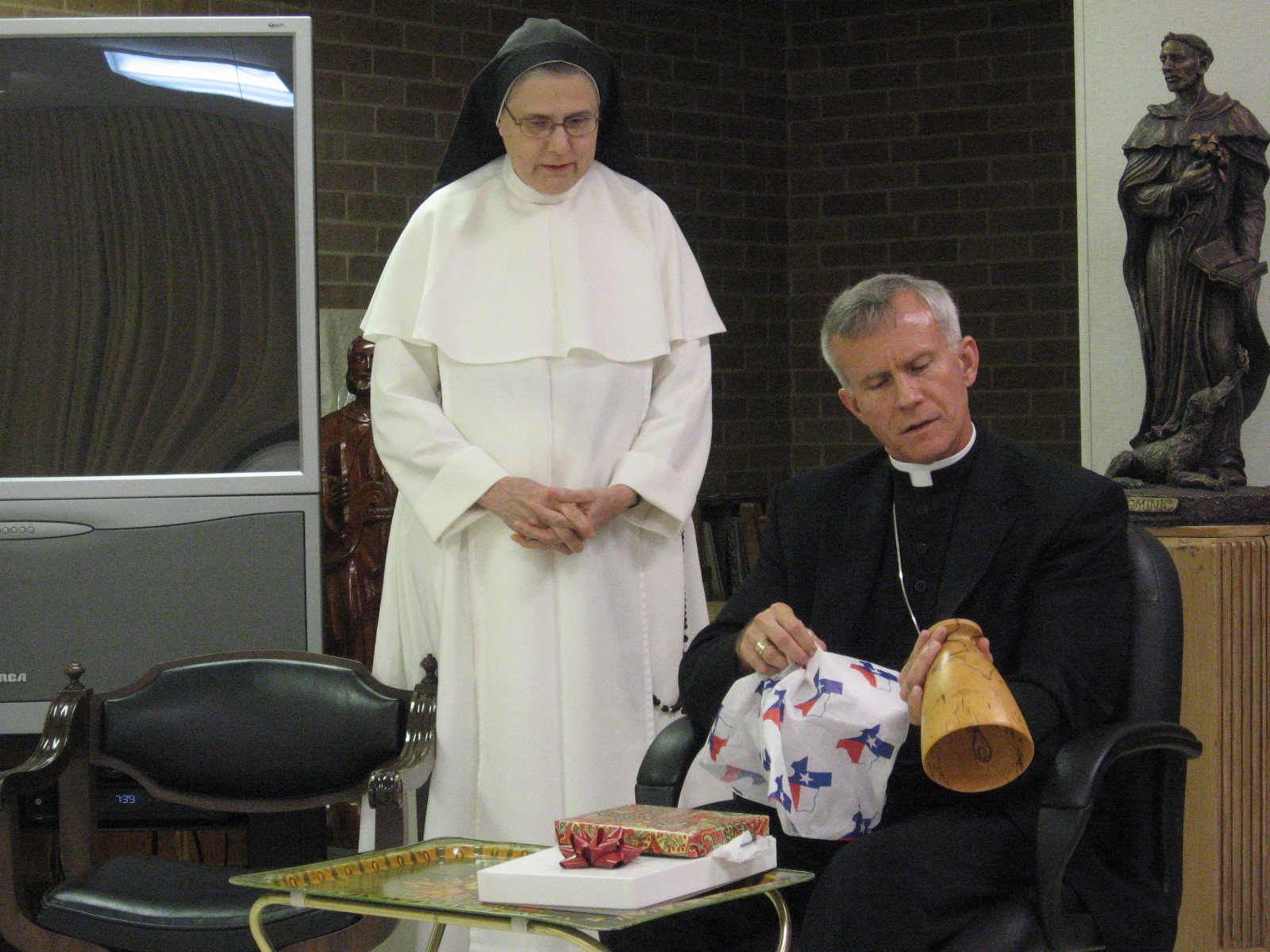 Bishop Strickland\’s birthday was on Halloween, so we presented him with a number of gifts for himself or places in the diocese. For example, we had a beautifully carved statue of St. Peter made from a tree trunk in Vietnam, which he wanted to put in the Chapel of Sts. Peter and Paul in Tyler. Our evening with the Bishop concluded right on time at 8 pm, when he drove back to Tyler and we went to Chapel to pray for his safety and Compline (Night Prayer).