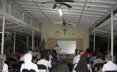 On several days, our Sister Mary Christine taught their sacristan, Sister Elizabeth, how to arrange flowers for the chapel. There is no shortage of flowers or greenery on the monastery grounds for fine arrangements. The Sisters often put 5 different arrangements in the chapel: beside and in front of the tabernacle, in front of the altar, by the statue of our Lady and one by a statue.St. Martin de Porres.