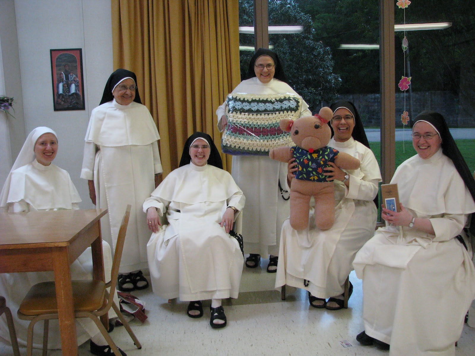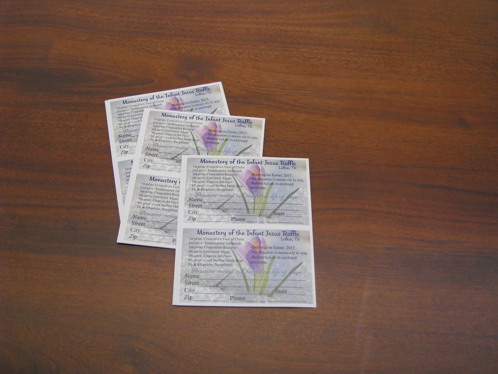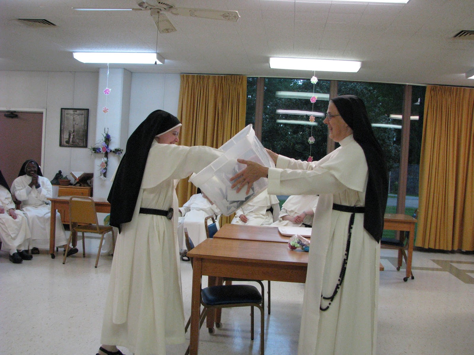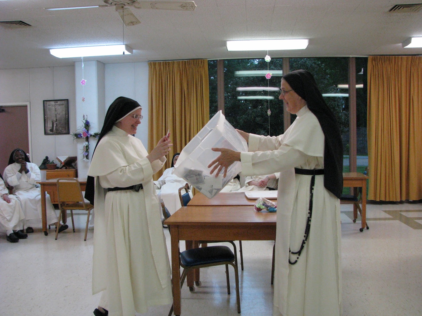 As has become our tradition, we have our annual raffle drawing on Easter. You can see the lovely 2017 tickets. This year we gathered in our Community Room for the ritual. The Sisters who made the various prizes drew the winning ticket for her project. Plus, as usual we had some extra surprises. It\’s always a little \”let down\” to stop drawing the tickets. We hate to stop. š