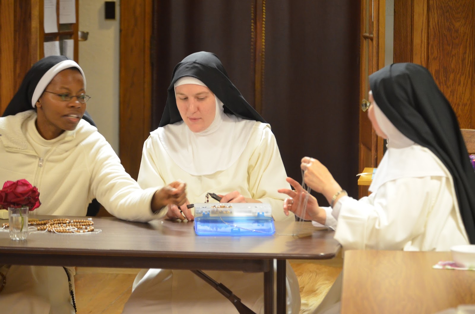 At evening recreation the Sisters enjoy sharing their talents, and learning how to things a bit differently. The Sisters here are working on making rosaries (left to right: Sr. Francisca, Sr. Mary Magdalene, and Sr. Mary Isabel)