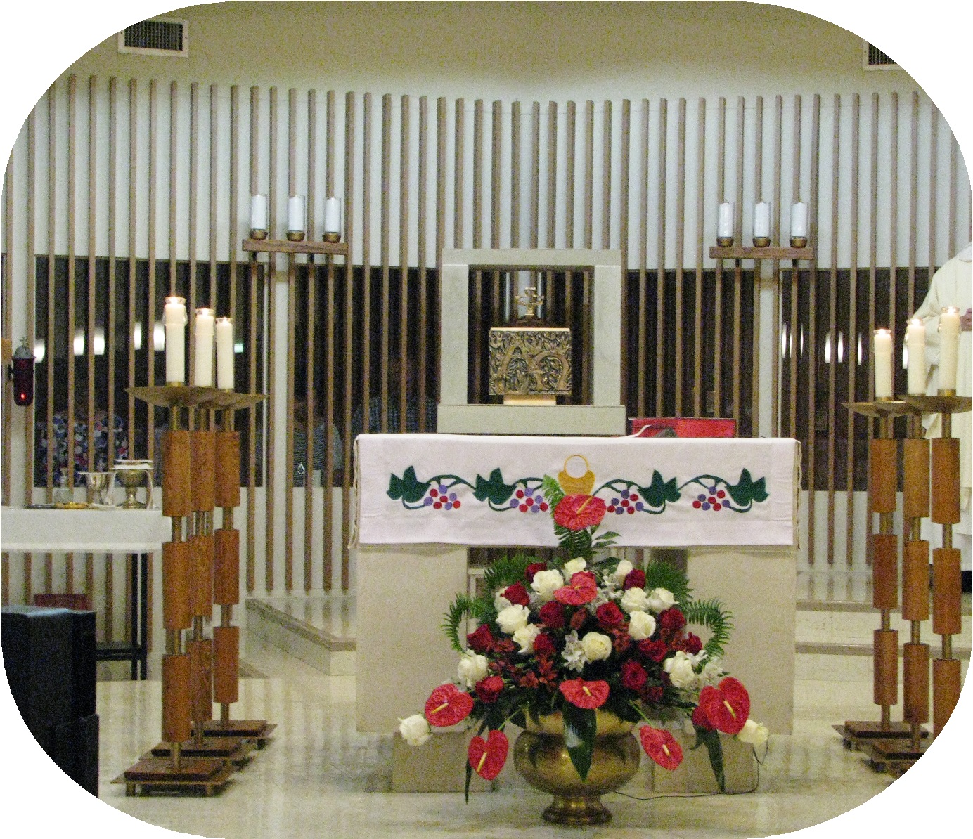 We had over 80 guests, so some went to our Oratory which we empty and open so people can come in there. They are behind the glass behind the altar. It\’s something like a “cry room”. The sound comes in, but we do not hear them. Some people said they went there so they could see the nuns! The bishop went to them when it was time to distribute Holy Communion. If you look closely you can vaguely see some people behind the wooden slats. Our sacristan made the beautiful flower arrangement.