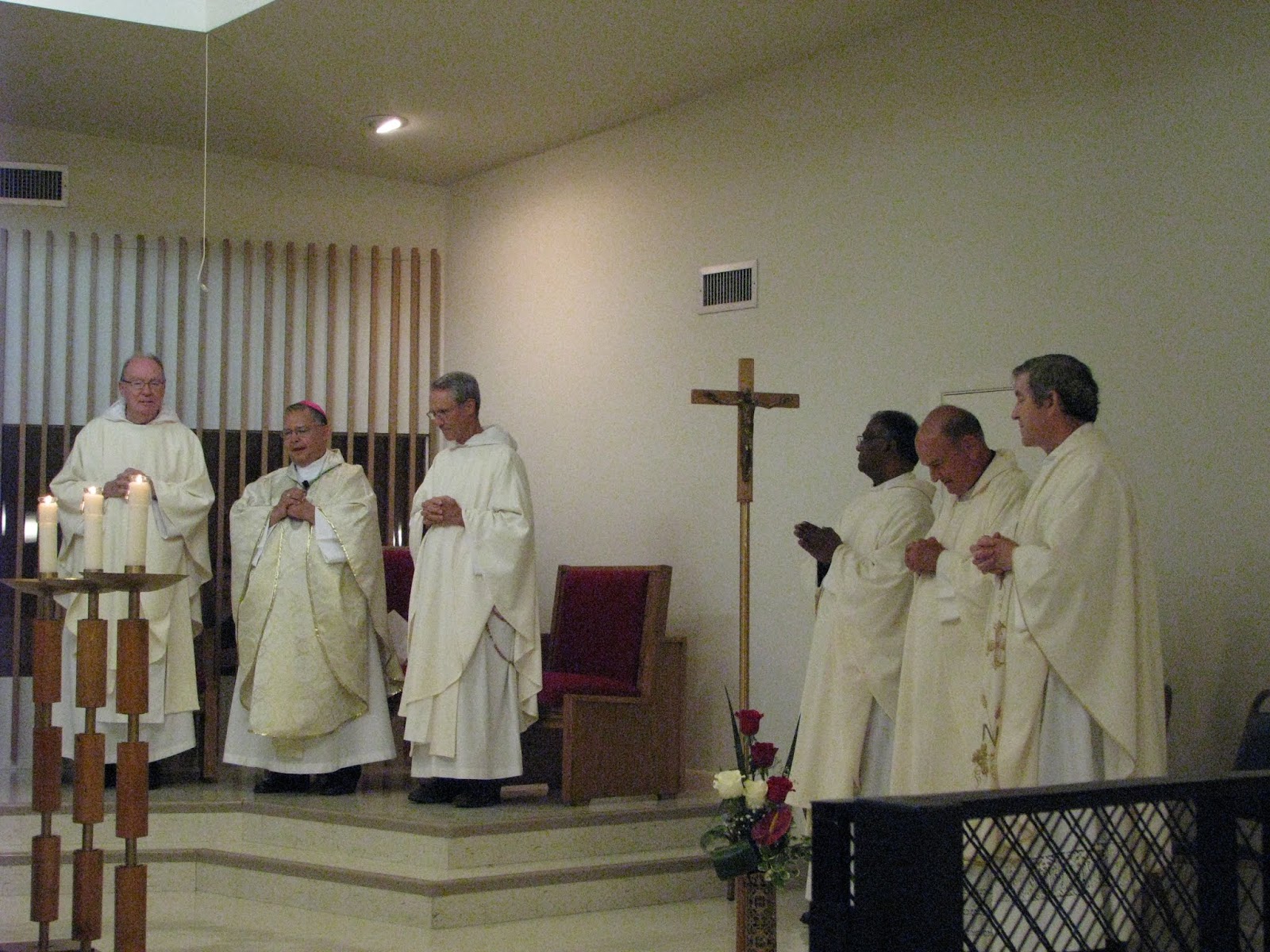 The principal celebrant was Bishop Eduardo Nevares, the auxiliary bishop in the Phoenix Diocese. He originally came to Lufkin as a seminarian and was missioned here off and on for many years. He even served as Pastor. The bishop is flanked by two Dominican friars of our Southern Province: On our left is Fr. John Lydon, OP, our resident chaplain; and on our right is Fr. Brian Pierce, OP who was the homilist at the Mass. He was very good and regaled us with stories of Sr. Mary Veronica (SMV) when he was a simple student at Stephen F. Austen University (SFA) up the road in Nacogdoches.