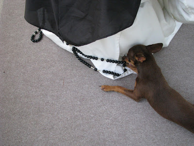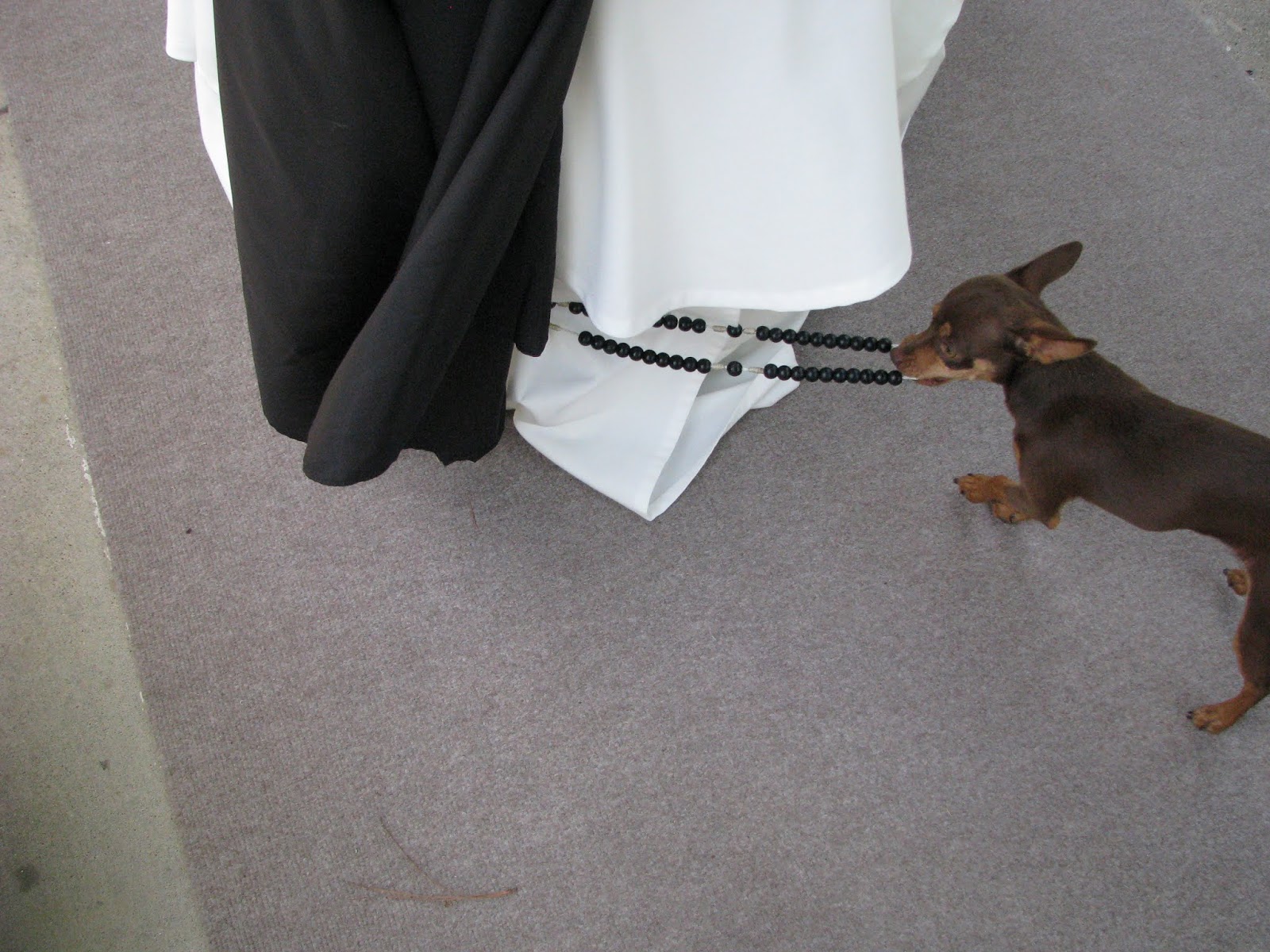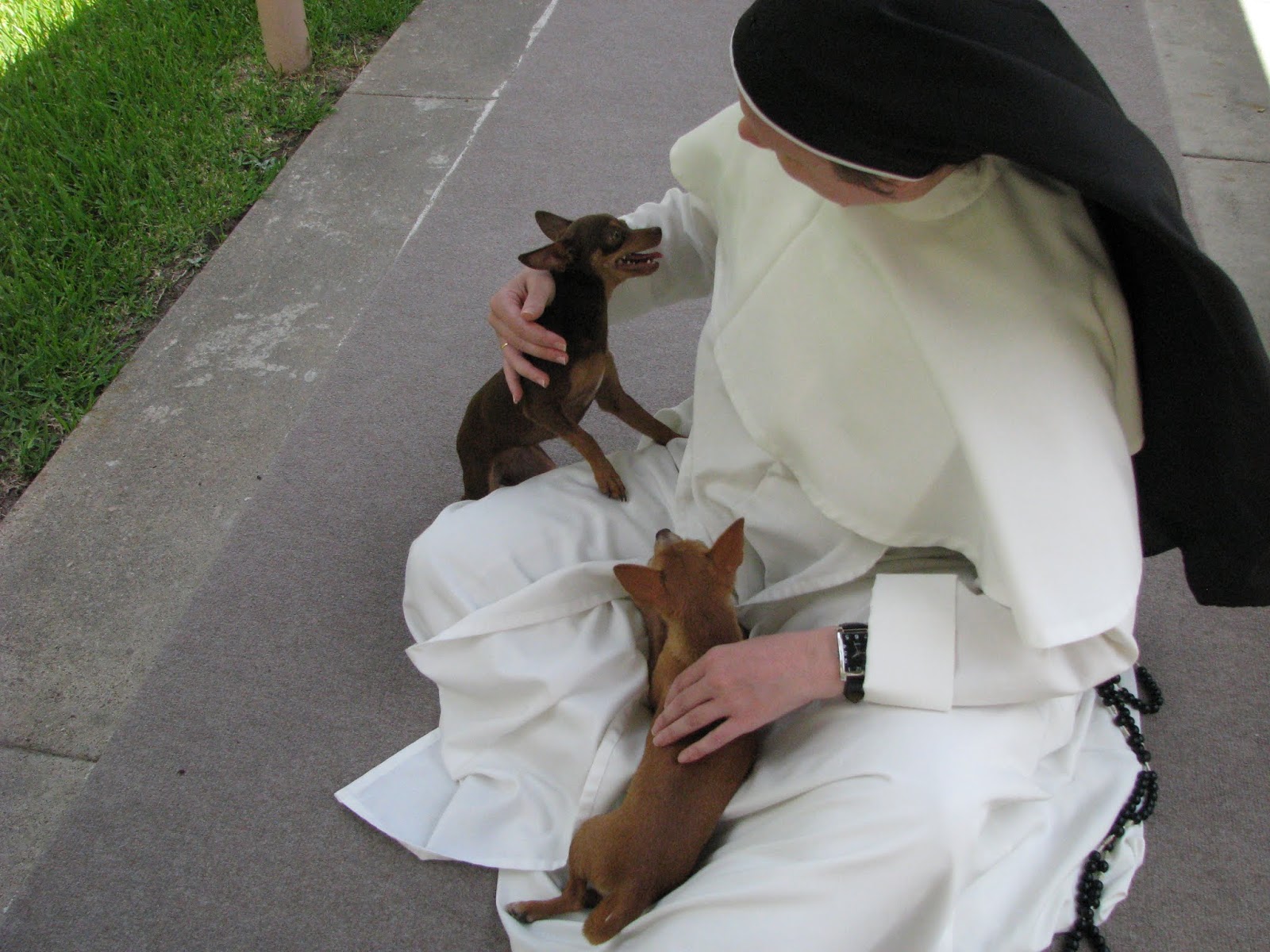 This past Sunday afternoon about 1:20, two little puppies appeared at our Novitiate door, looking for someone to play with. They were very friendly and cute. Both females, they looked young and had lovely markings. One was light brown with four white feet and a white line on her forehead. The other, shyer one, was dark brown with dazzling, almost blue eyes.