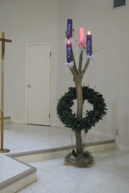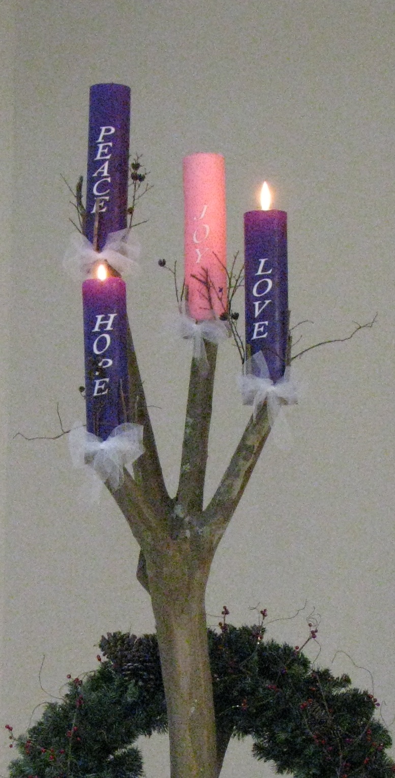 Our wreath images this new shoot. The stump that has grown up represents the hand of God. The wreath is on the thumb, while the other four fingers become flames of fire as the weeks progress.
