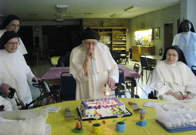 Our Sister Mary Sybillina celebrated her 92nd Birthday last weekend! In honor of the occasion we had a little party with ice cream and cake in our Community Room. She cleverly “blew” out her TWO candles with one of those blow toys for a party.
