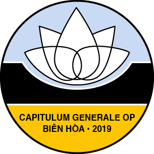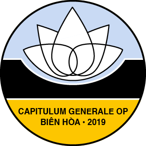 The meaning of the symbolism: the design above is a lotus blossom, the national flower of Vietnam, as well as a common flower throughout Asia. The black below it represents the Dominican cappa, or mantle. The words indicate, in Latin, the General Chapter, and the city where it is being held, Biên Hòa, Vietnam, near Saigon, in the south.