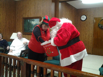 In the background you can see that our chaplain, Fr. John, came to join in with the festivities. Also present was a friend of “Mrs. Elf”.