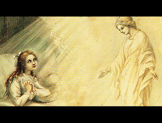 For those unfamiliar with the life of St. Therese of Lisieux, this is a painting that tries to express the moment in her life when everyone had given up hope of her recovery from a mysterious illness. Suddenly, the statue of Mary seemed to come to life and smile at the sick girl, and she immediately recovered.
