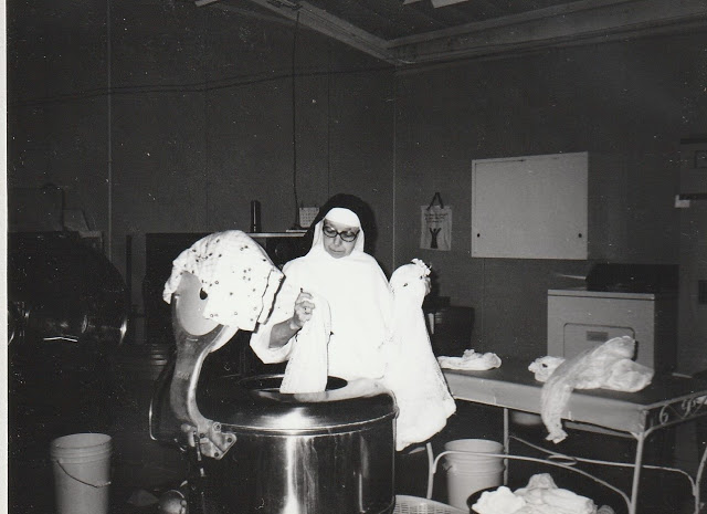 | Sister Mary Sybillina at work in the laundry. We still use this extractor! (They don’t make them like the used to…) |