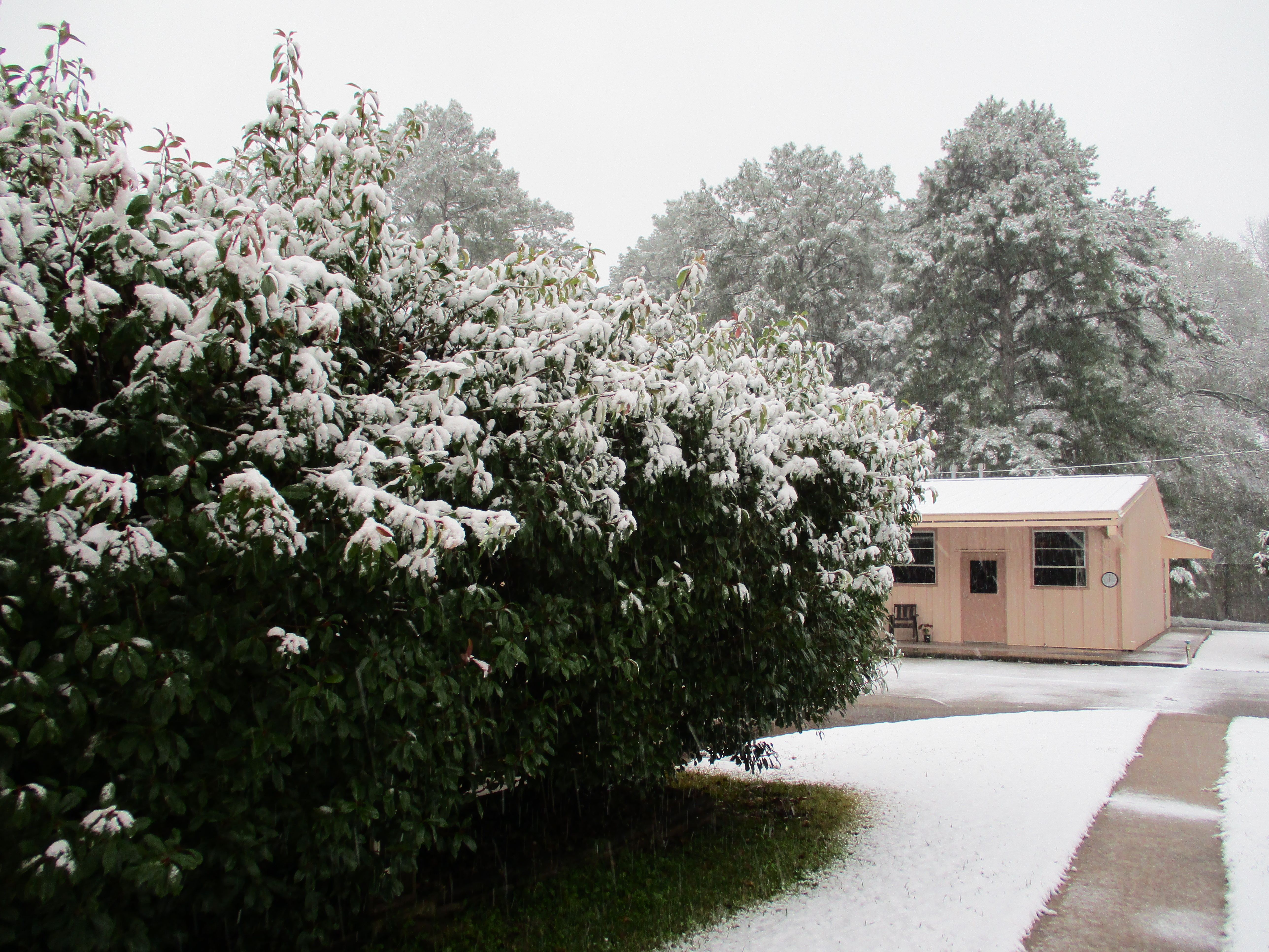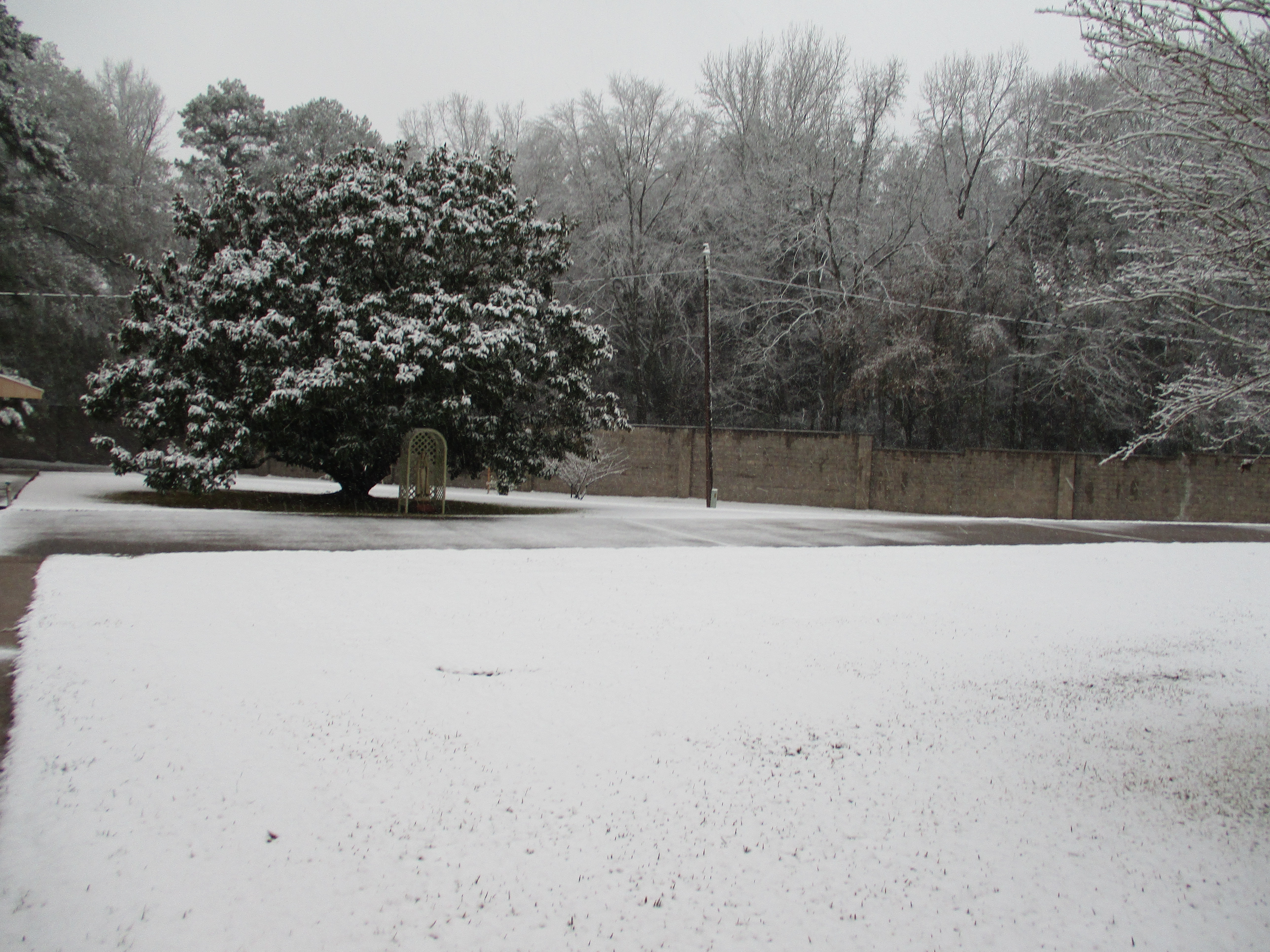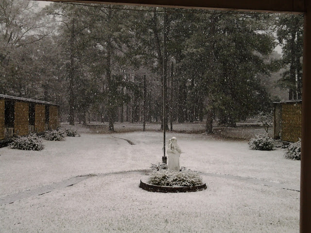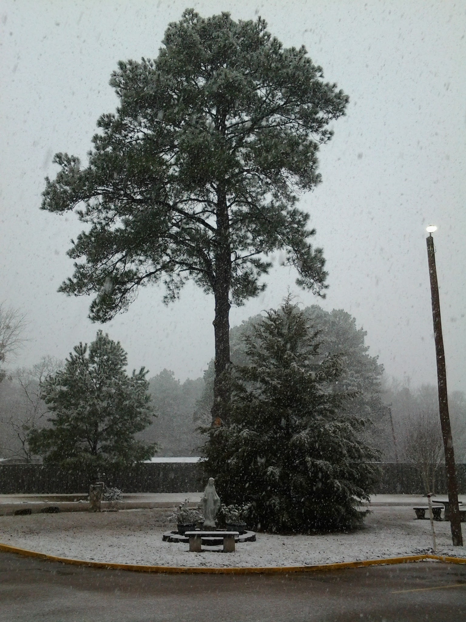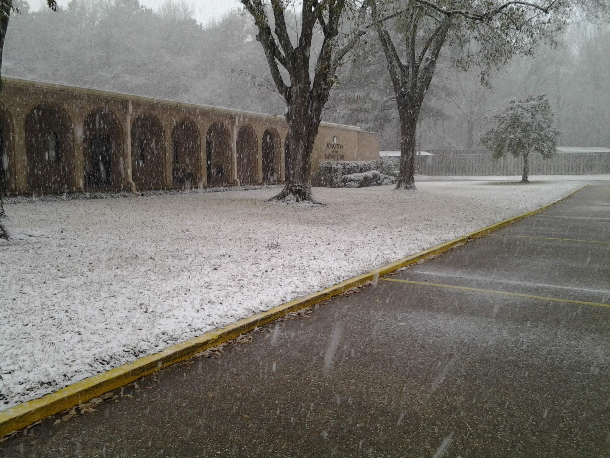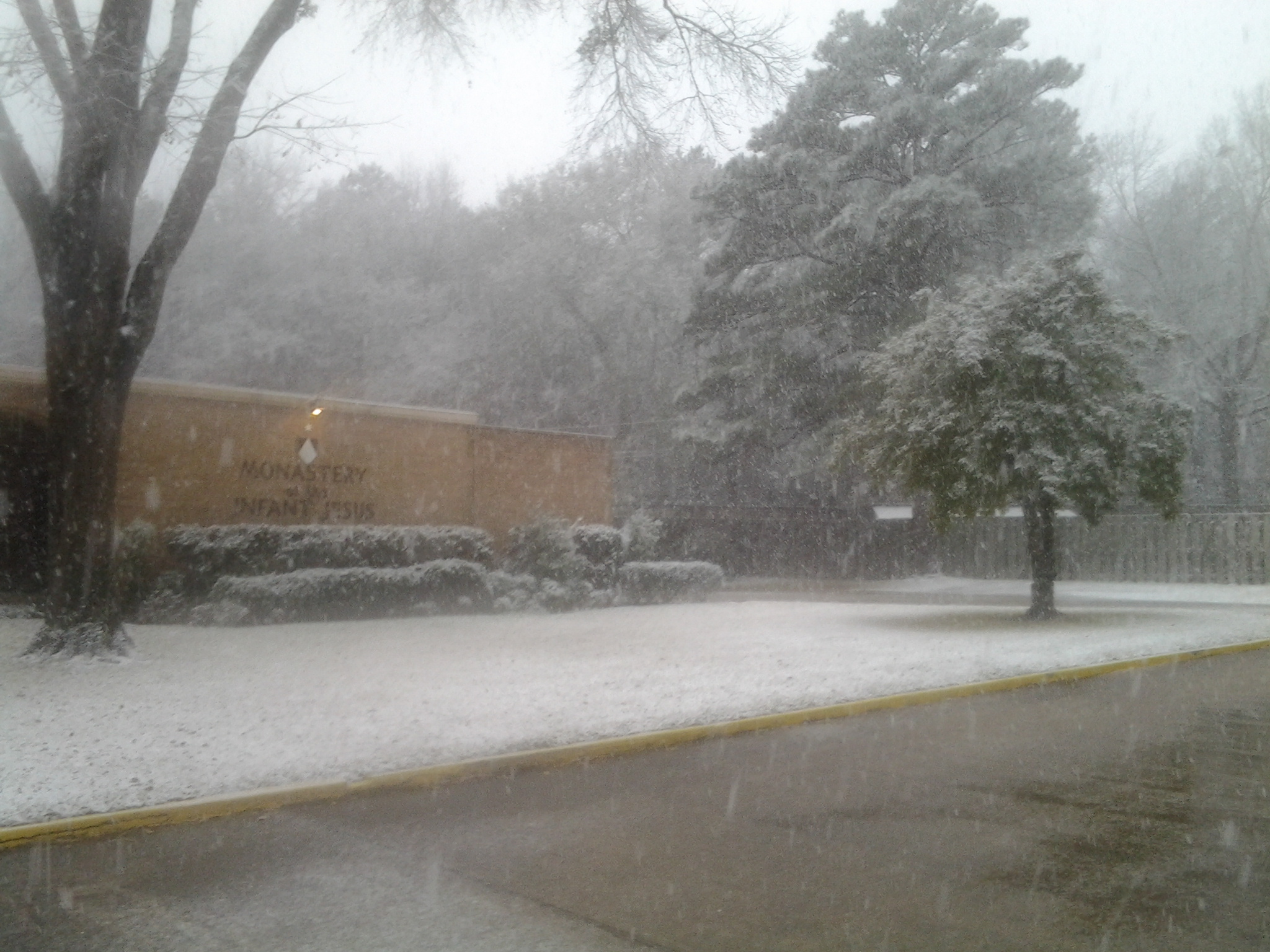 While we do occasionally get snow in Texas, it\’s rare in Lufkin–and this was (for us) quite a snow! We got a couple of inches in most parts–enough to completely cover the grass and even enough to make a snowman (or snow nun). We realize those of you in northern climes are probably smiling at this, but most of us come from warmer regions of the world and we were delighted! Also we didn’t have to drive in it–native Texans tend to be very bad at driving in snow. We actually got even more snow after these pictures were taken!