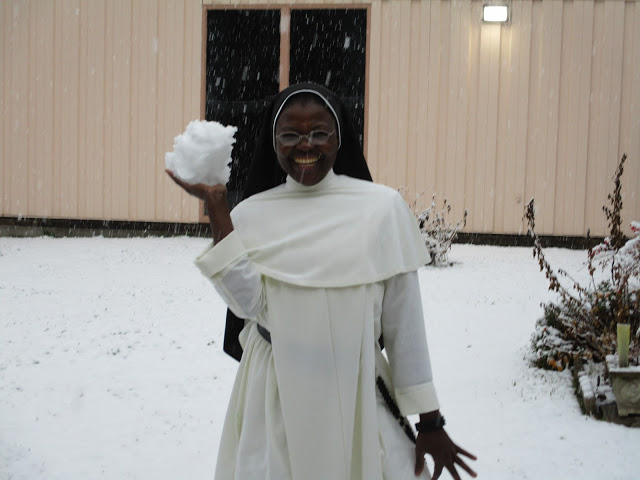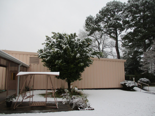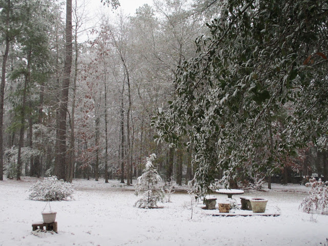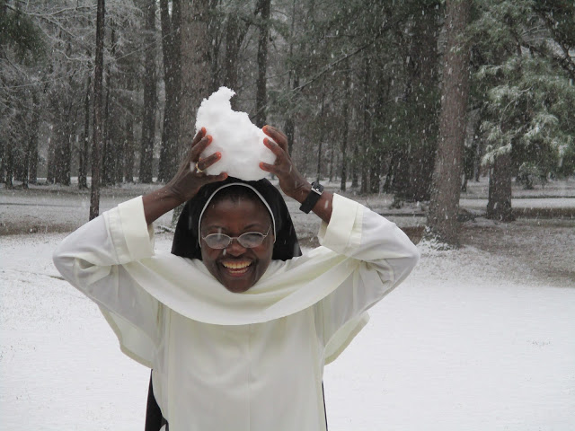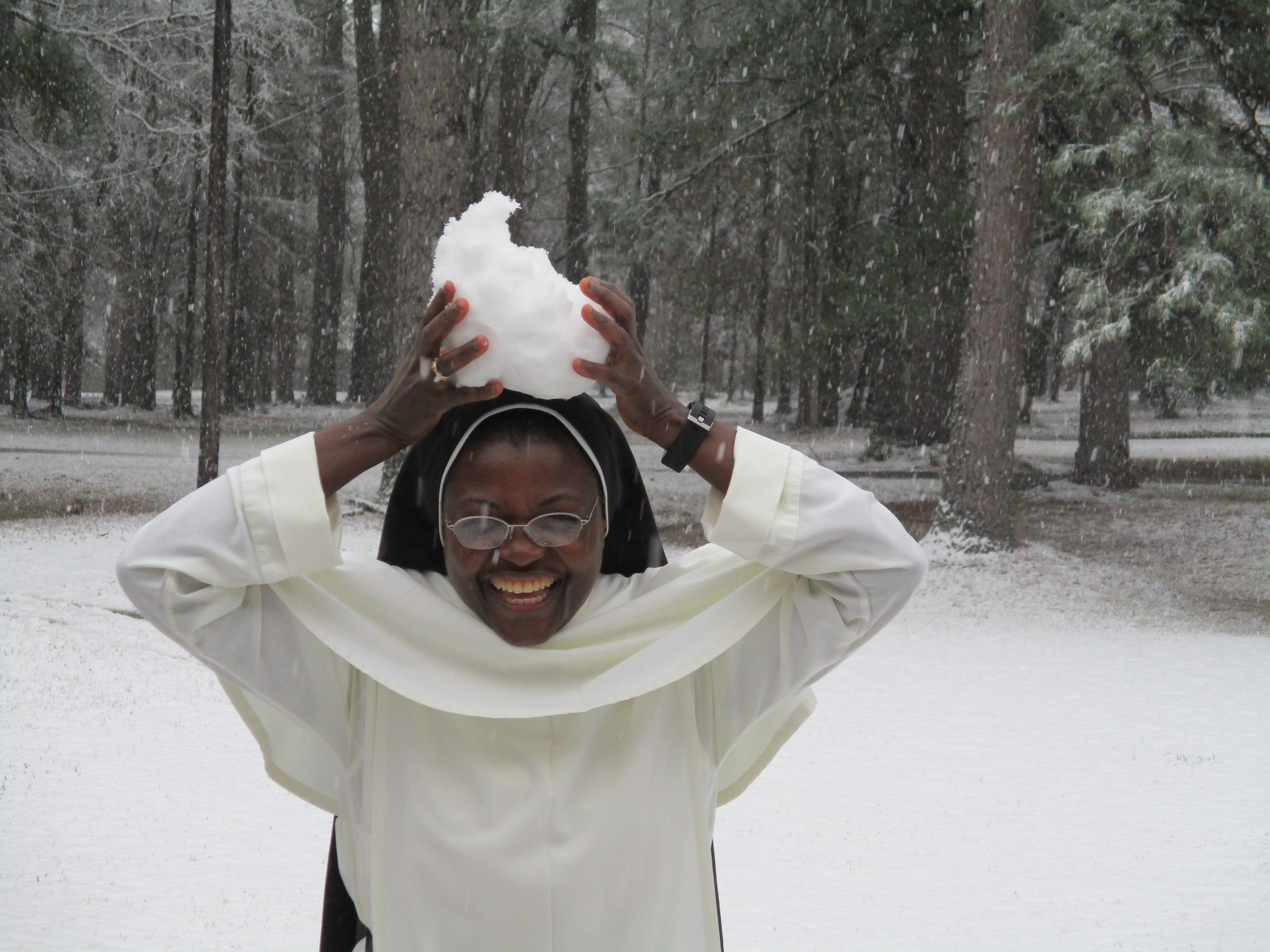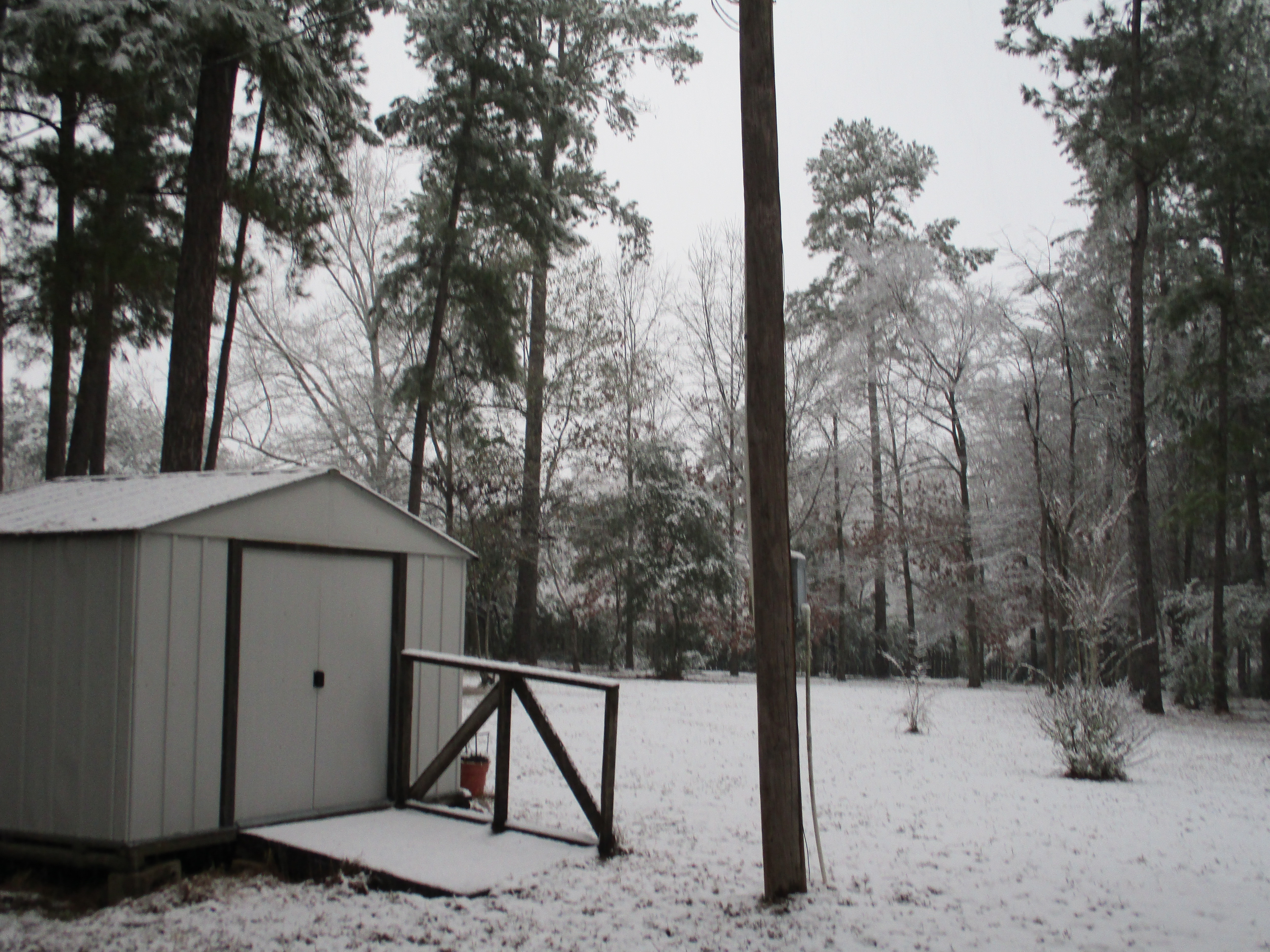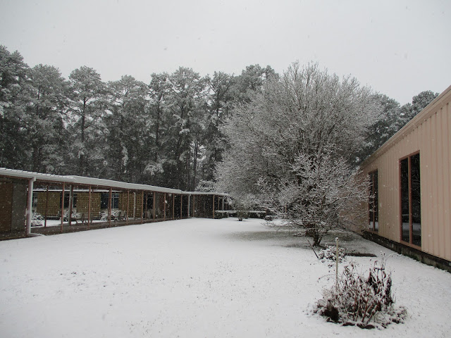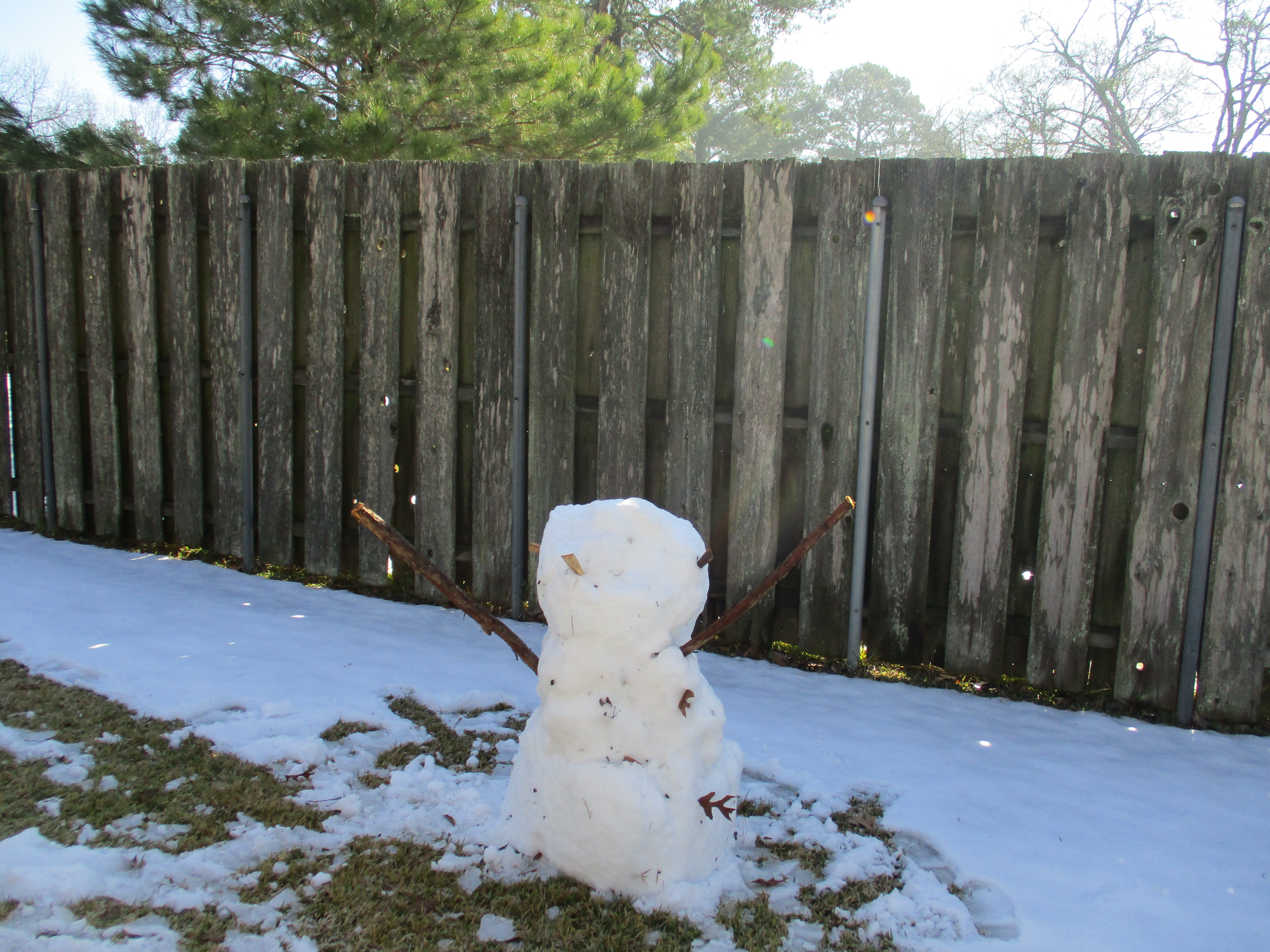 While we do occasionally get snow in Texas, it\’s rare in Lufkin–and this was (for us) quite a snow! We got a couple of inches in most parts–enough to completely cover the grass and even enough to make a snowman (or snow nun). We realize those of you in northern climes are probably smiling at this, but most of us come from warmer regions of the world and we were delighted! Also we didn’t have to drive in it–native Texans tend to be very bad at driving in snow. We actually got even more snow after these pictures were taken!