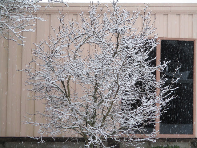 The snow fell Sunday afternoon and evening, and here on Tuesday it is still covering a lot of ground, thanks to some freezing weather. Another amazing event! However, the sun has been shining and gradually melting everything, so by tomorrow our extraordinary snow will be most likely be a fond memory. This is probably our last chance for snow this year–but who knows? One year it snowed on Easter–and Easter was at the beginning of April! Let it snow!