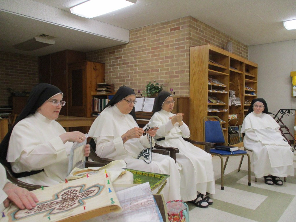 Sr. Mary Christine tells her story while the other nuns listen, working on handwork