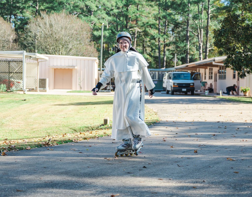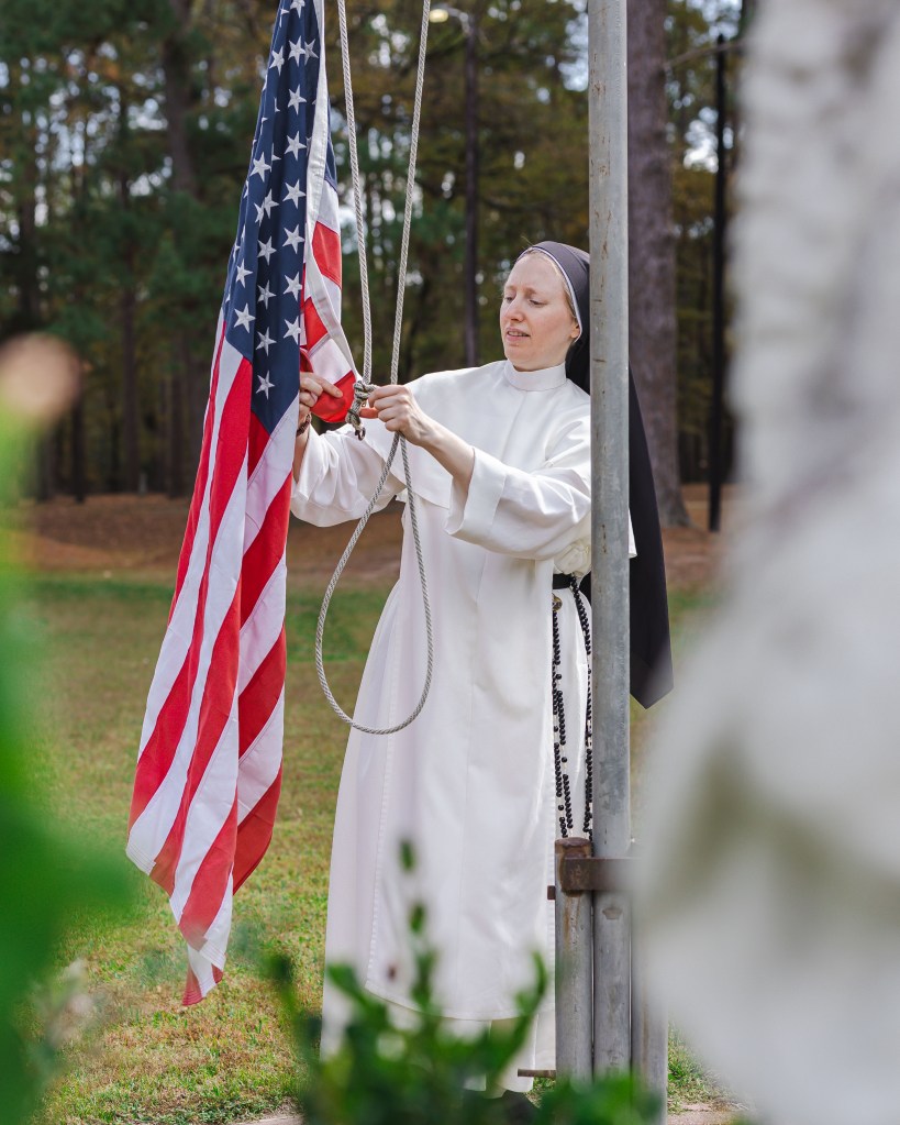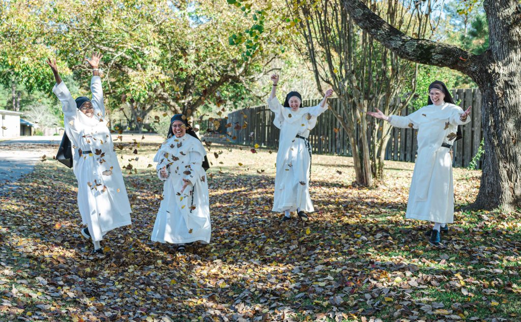 We wanted a new group photo of our community, as well as updated individual portraits. The photographers thought natural lighting would be best, so we all went outside and dutifully posed for the pictures. It was a beautiful day, but also quite windy, so we had to help each other smooth down our veils and capes so the photographers could quickly snap good pictures of us.
