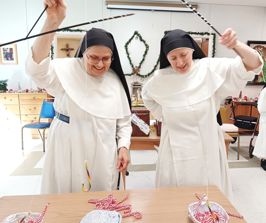 Sr. Mary Margaret and Sr. Mary Therese race to be the first to fish out all of the candy canes. It was tricky!
