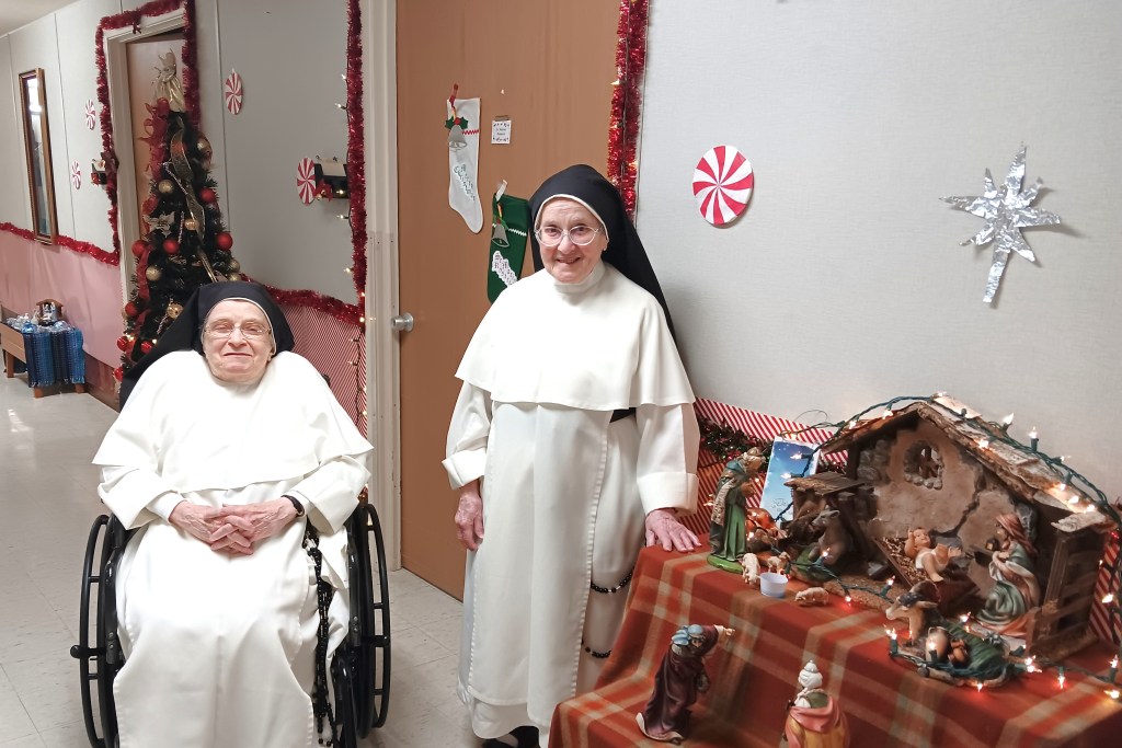 Sr. Miriam and Sr. Maria Rosario with the creche in the infirmary