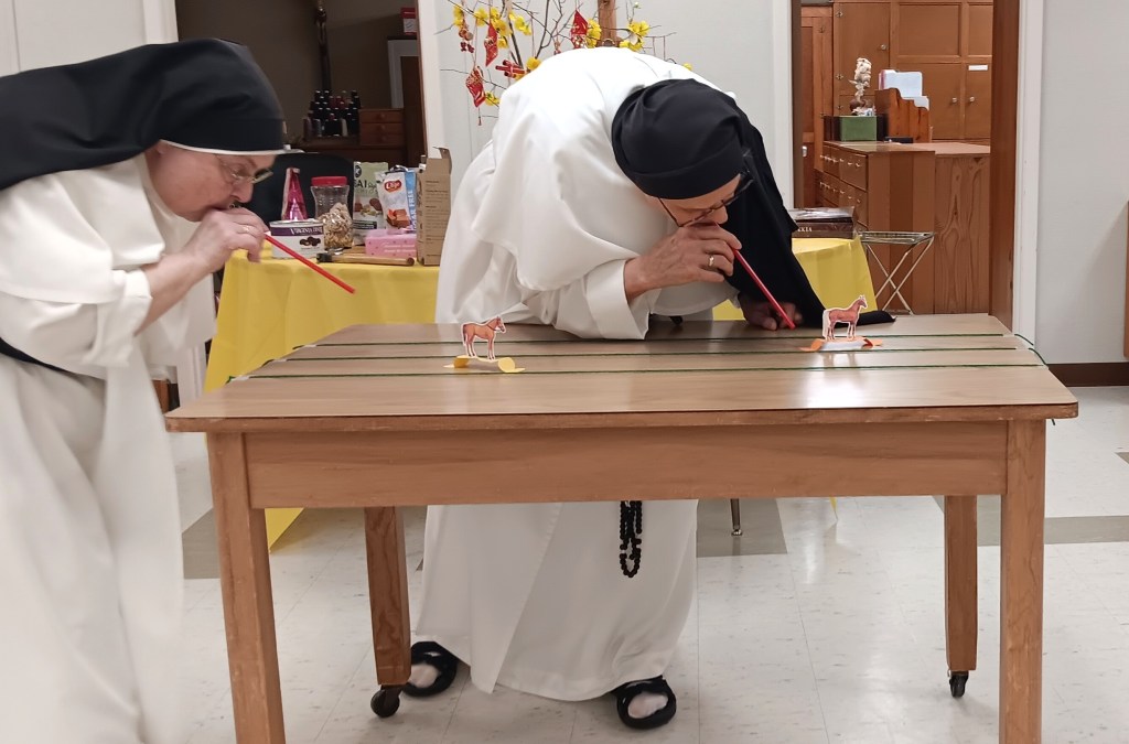 Sr. Mary Jeremiah and Sr. Mary Margaret blow their horses across the table.