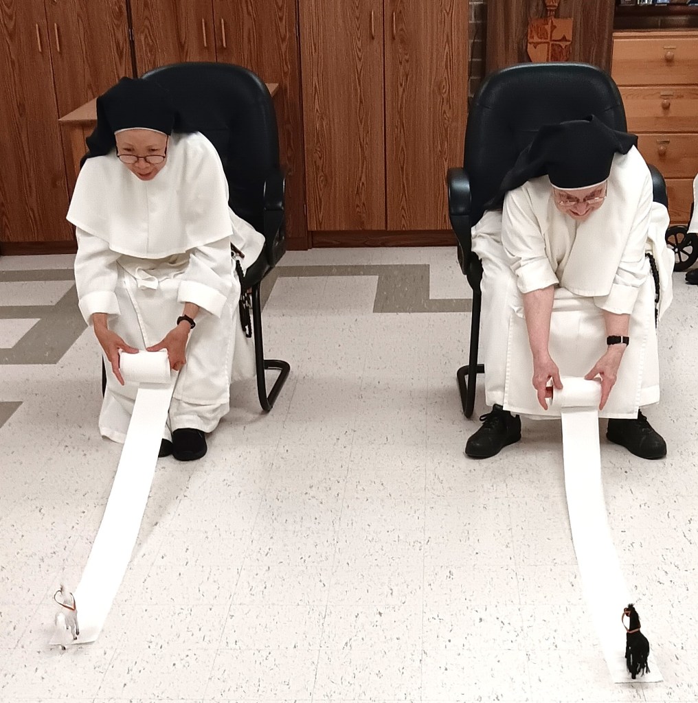 Sr. Mary Giuse and Sr. Mary Therese start the horse race.