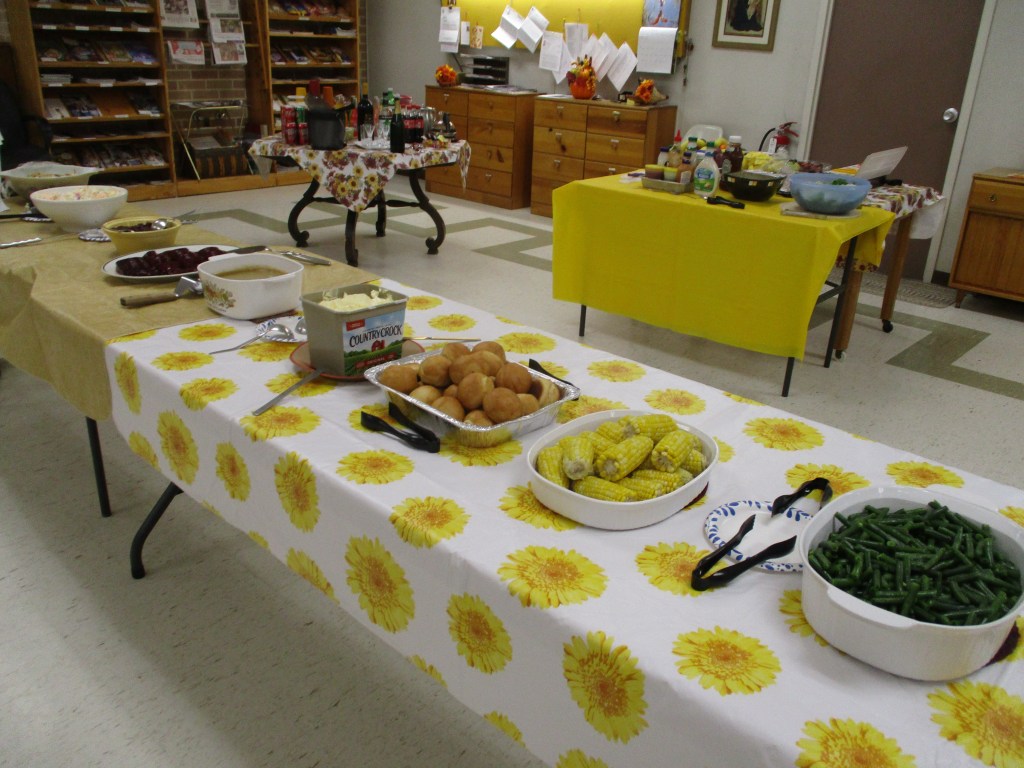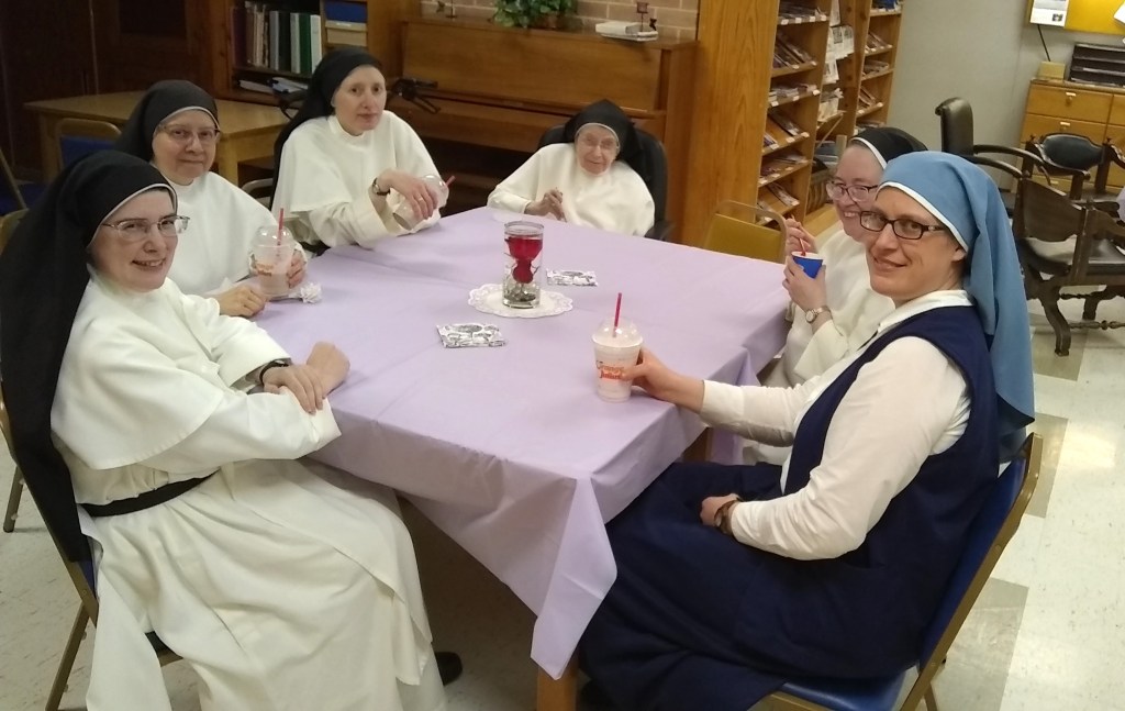 Sr. Mary Pauline, Sr. Mary Giuse, Sr. Mary Jeremiah, and Michelle seated at one of the decorated tables in the community room.