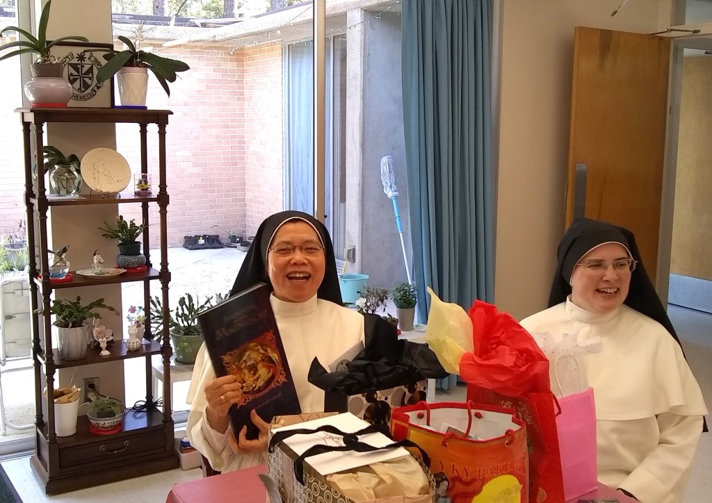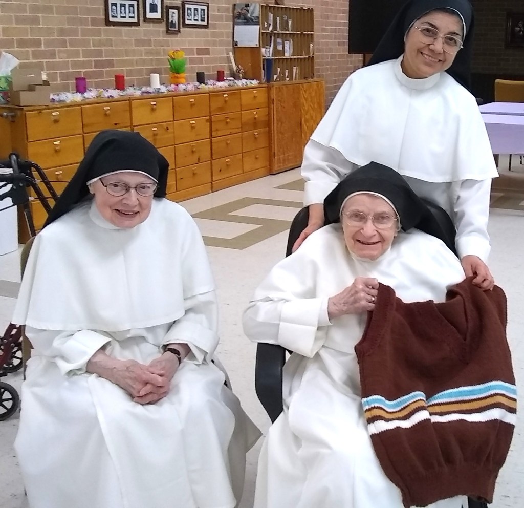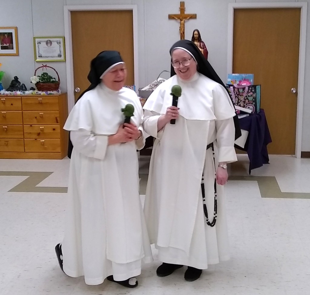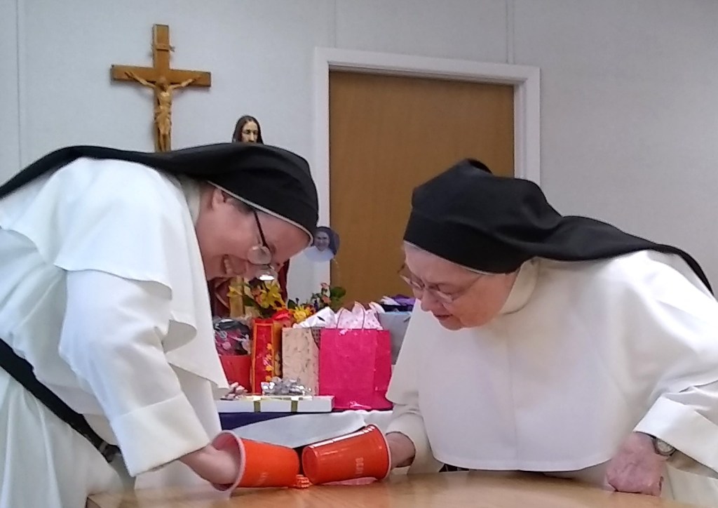Sr. Mary Margaret, our “mother prioress”, and Sr. Mary Rose holding the card she designed for Sister. We each promised to offer three days of prayer for Sr. Mary Margaret’s intentions.