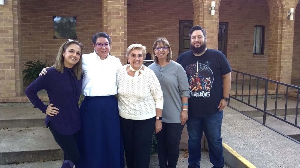 Fr. Reginald has been a big Texas fan for many years, thanks to his father’s love for John Wayne movies (especially “The Alamo”), and various people in our community took him on many Texas adventures, including visits to a Native American reservation, Nacogdoches TX (the oldest town in Texas), the San Jacinto battlefield, and, yes, the Alamo! He bought this hat for himself soon after his arrival, but we had some gifts for him, too–especially this one: